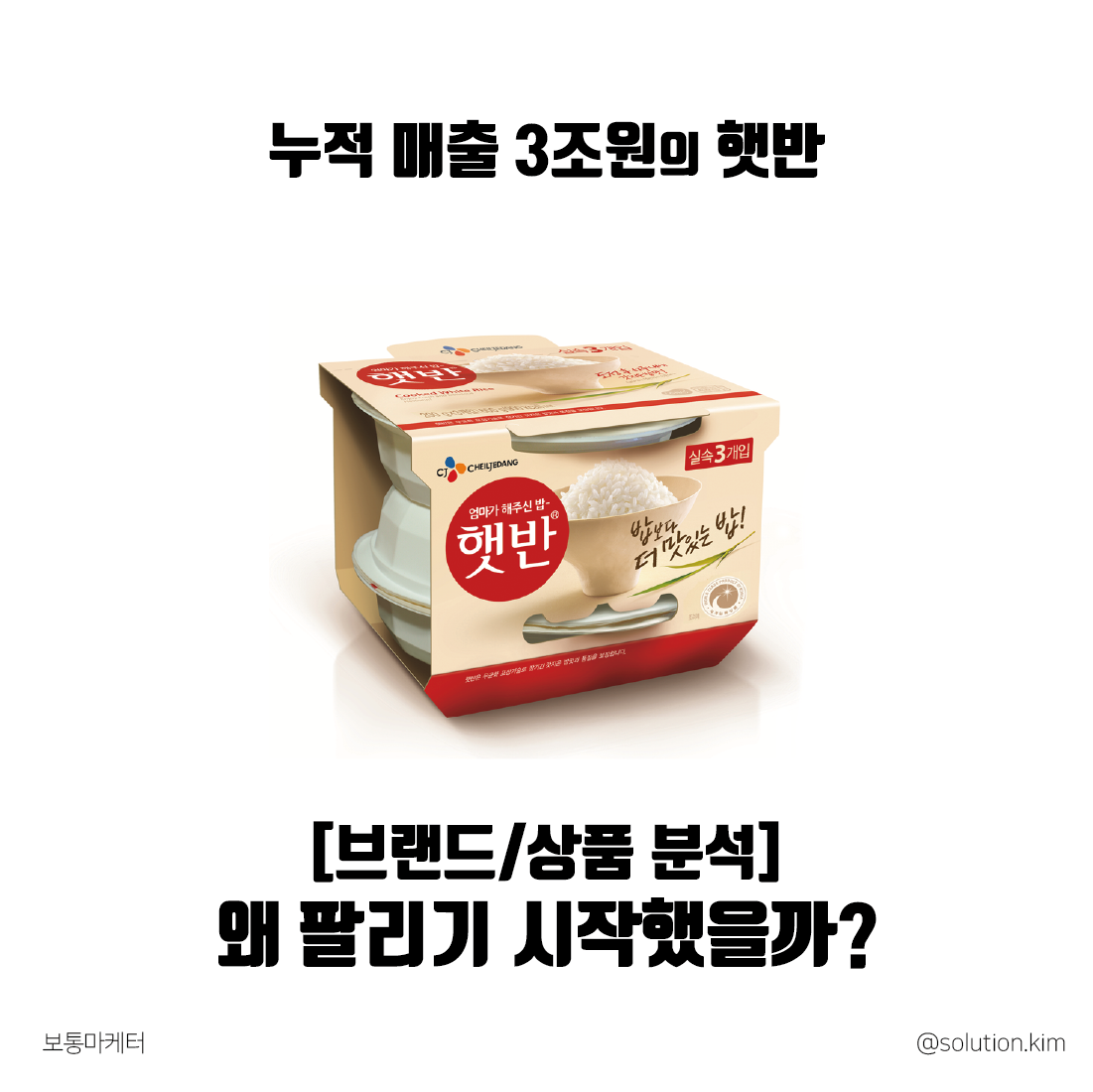 2020년 기준으로 즉석밥 시장 부동의 1위인 햇반은 누적 매출 3조원을 넘어섰어요. 식품 업계에서는 천 억만 넘어도 빅 히트라고 하는데 이를 30배나 넘어선 거죠. 그럼 햇반은 어떻게 이런 위치에 올라설 수 있었을까요? 그 과정을 상품의 도입기-성장기-성숙기를 기준으로 소개해보겠습니다.