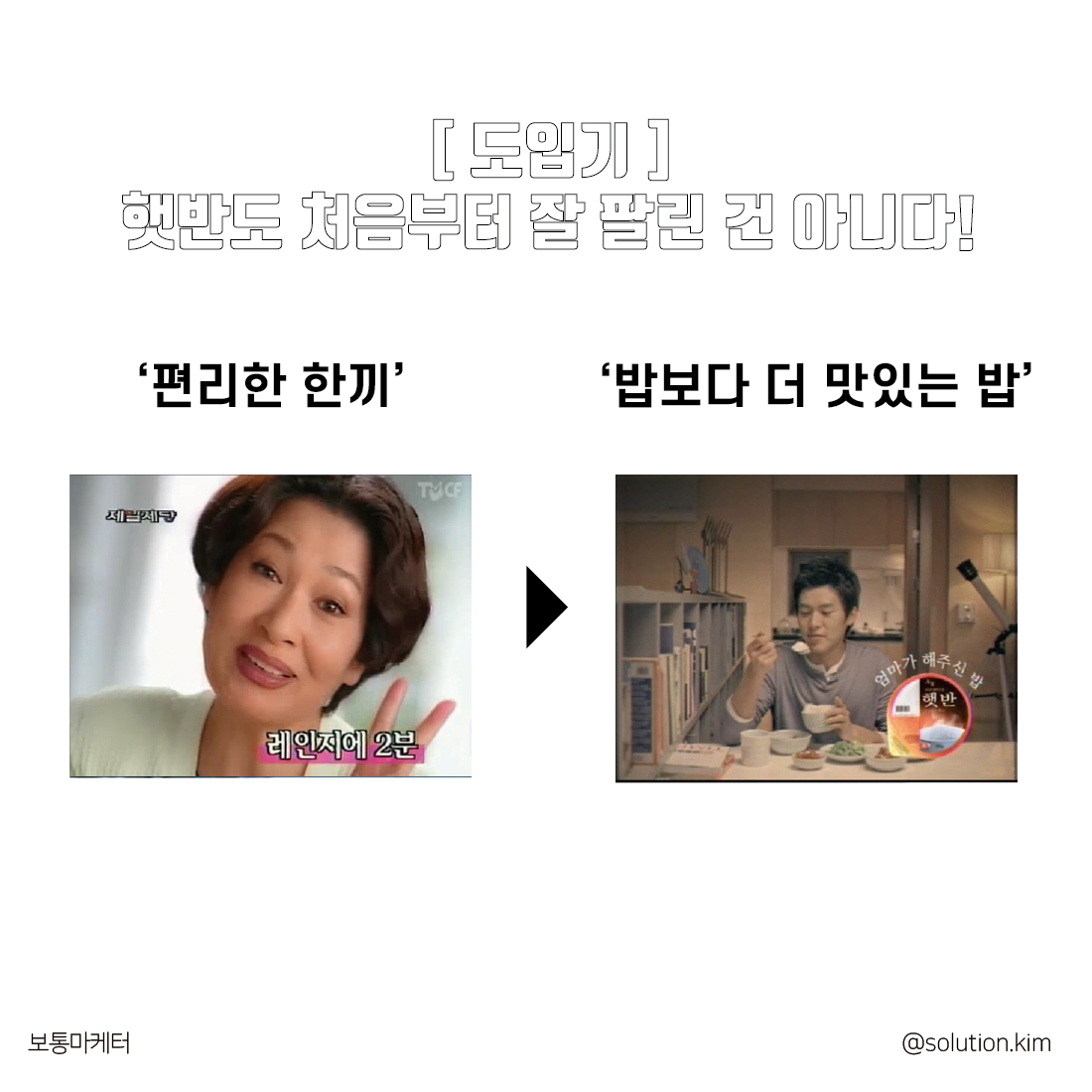 판매에 반전을 만든 건 햇반의 첫 광고인 ‘편리한 한끼’에서 ‘밥보다 더 맛있는 밥’으로 변경되면서부터 였습니다. 주요 타깃인 주부에게 ‘편리한 밥’는 가족에게 미안하고 죄책감을 주는 커뮤니케이션이었고 ‘맛있는 밥’은 미안함과 죄책감을 덜어주면서 고객의 선택을 받을 수 있게 됩니다.