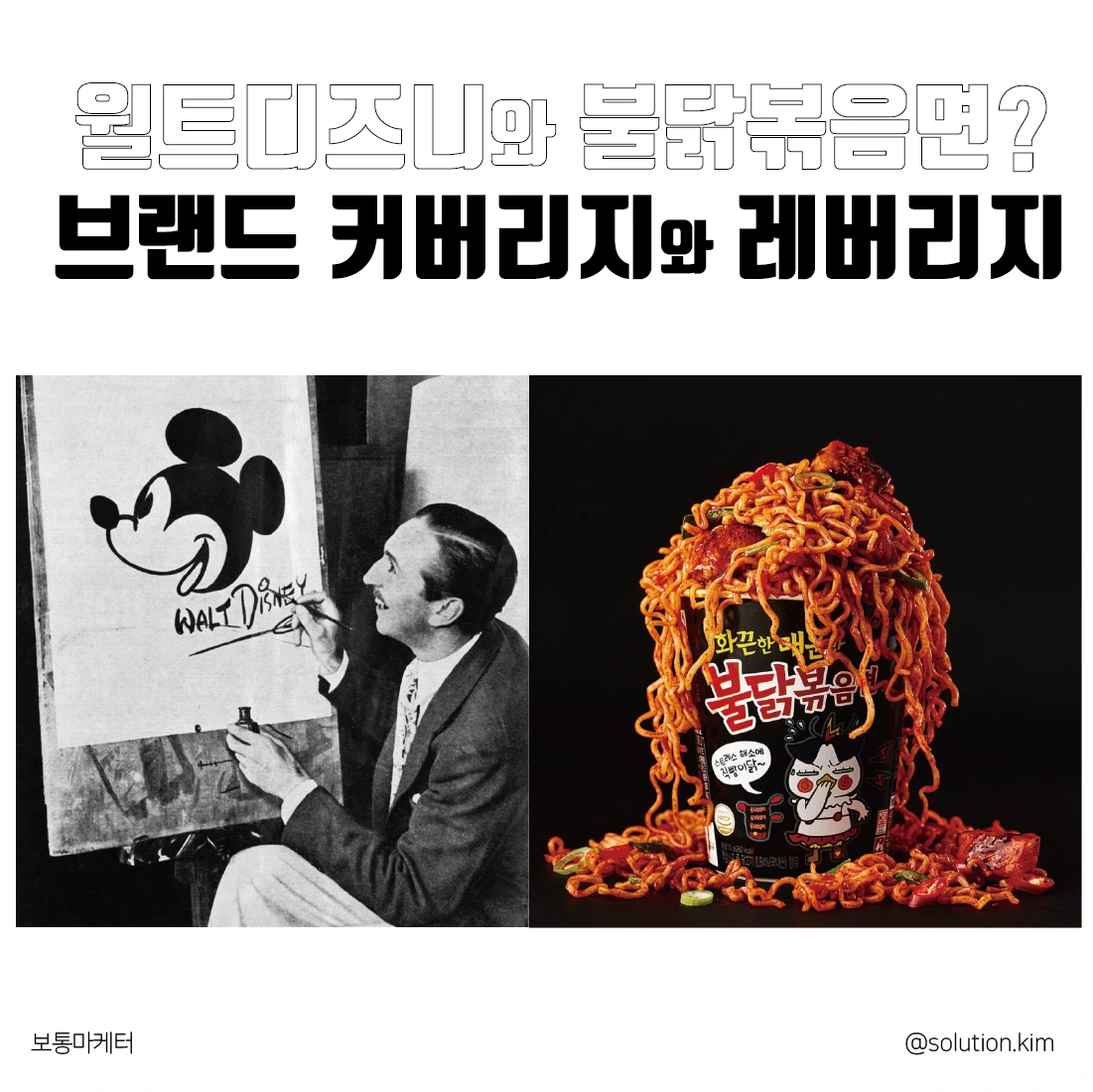 브랜드/마케팅 업종에 일하다 보면 브랜드 커버리지와 브랜드 레버리지라는 용어를 한번쯤은 들어보셨을 겁니다. 발음상 비슷하게 들리는 두 단어가 브랜드와 연결되면 전혀 다른 의미로 적용되기 때문에 이를 정확히 이해할 필요가 있는데요. 이번 글에서는 불닭볶음면과 디즈니 사례를 통해 브랜드 커버리지와 레버러지에 대한 개념을 명확하게 알아보도록 하겠습니다.