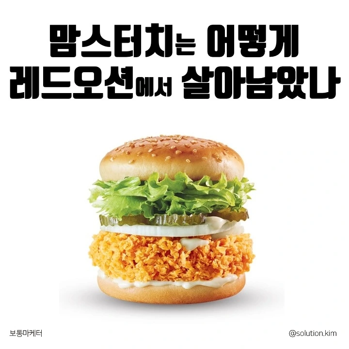 레드오션 시장에서 맘스터치가 살아남을 수 있는 방법은 선택과 집중이었습니다. 경쟁사가 집중하지 않지만 수요 확장의 기회가 있는 치킨버거를 브랜드 포트폴리오의 중심에 둡니다. 그리고그 선택은 적중하죠.
