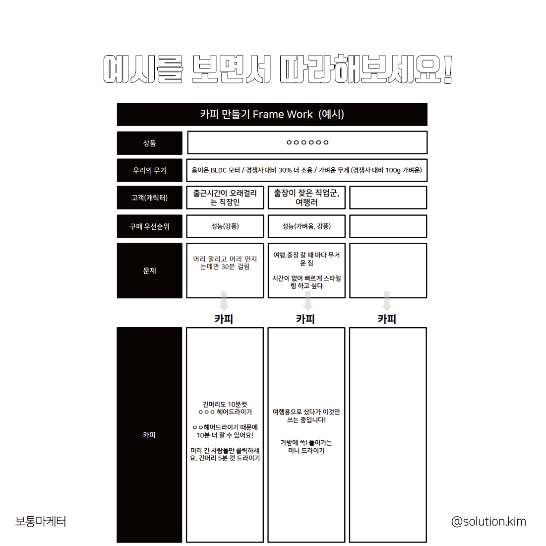 카피를 쓰기 위해서 저는 [우리의 무기] [고객 문제] [레퍼런스]를 일렬로 세워두고 고민하는 편입니다. 꽤 쏠쏠하게 성과를 만들었던 사례 중 헤어드라이기를 예시를 들어보겠습니다.