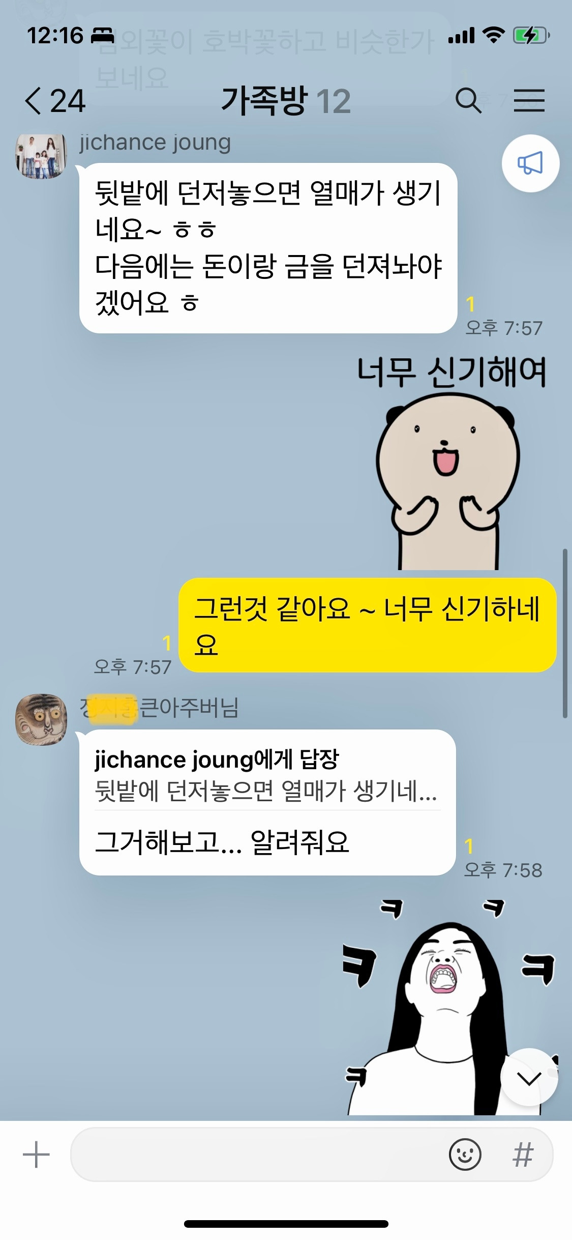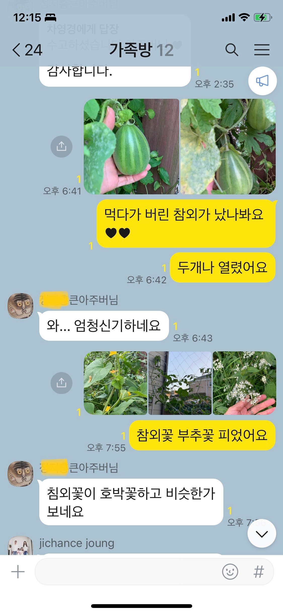 가족 카톡방에 참외 소식을 전했더니 큰 아주버님께서 답글을 써주셨다. 같이 신기하다고 하는 찰나,