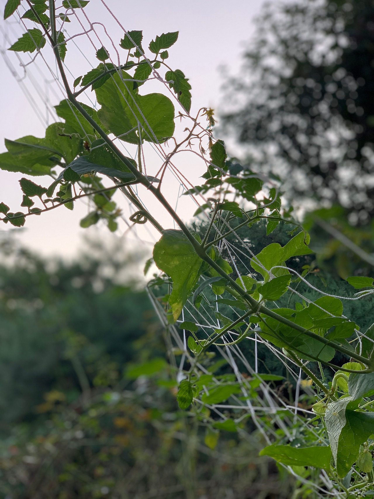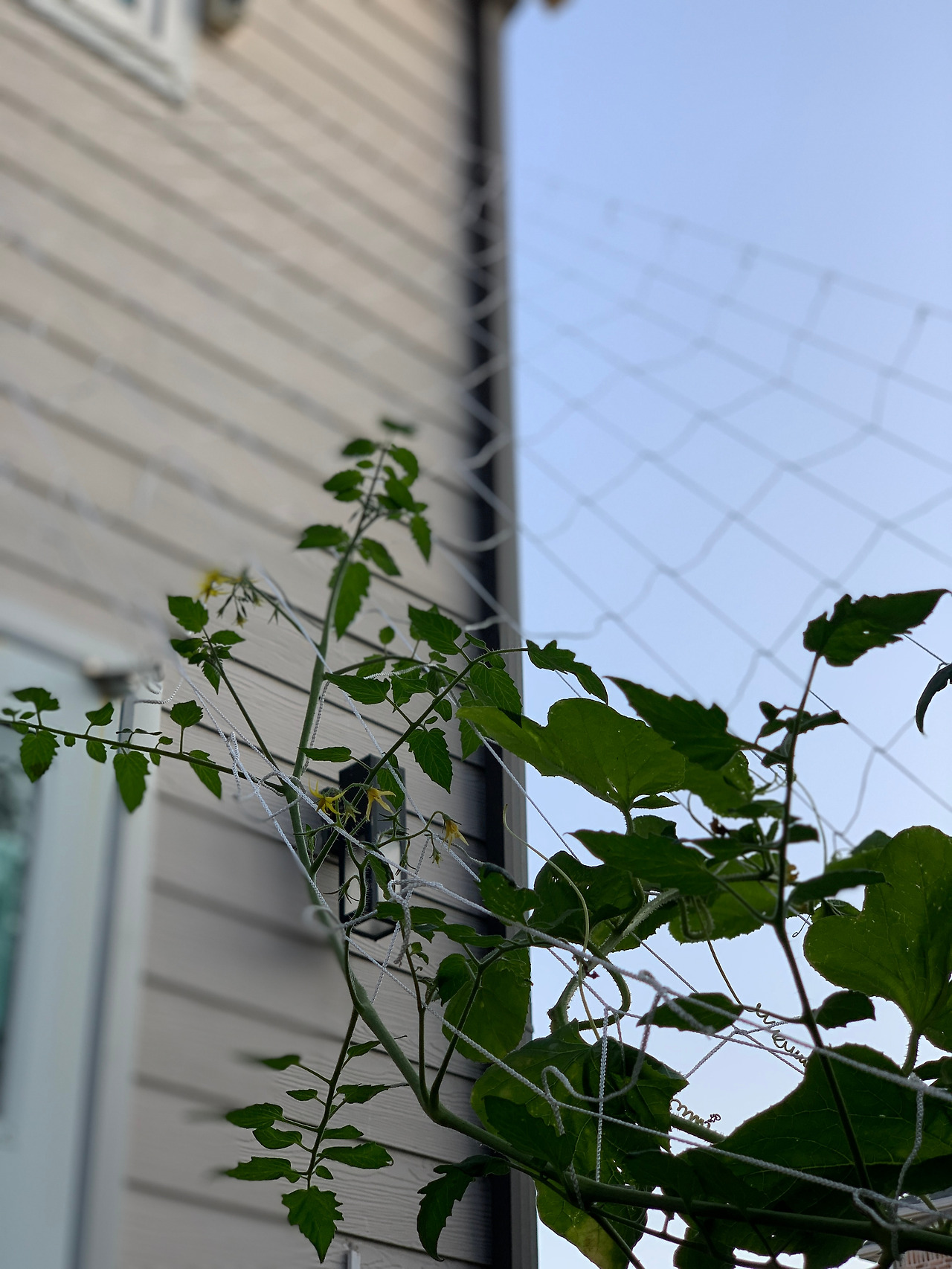 게으른 농사꾼인 우리 두 사람은 뒤늦게 그물망을 2층 딸의 방 창문에 연결해 덩굴식물이 타고 갈 수 있게 해 주고 땅을 기어 다니는 키 큰 토마토를 걸어주었다.