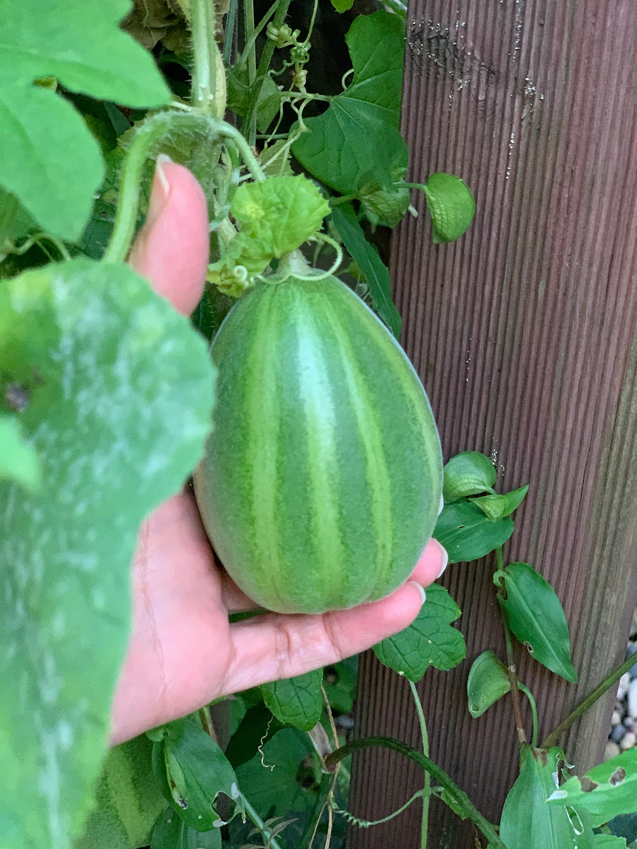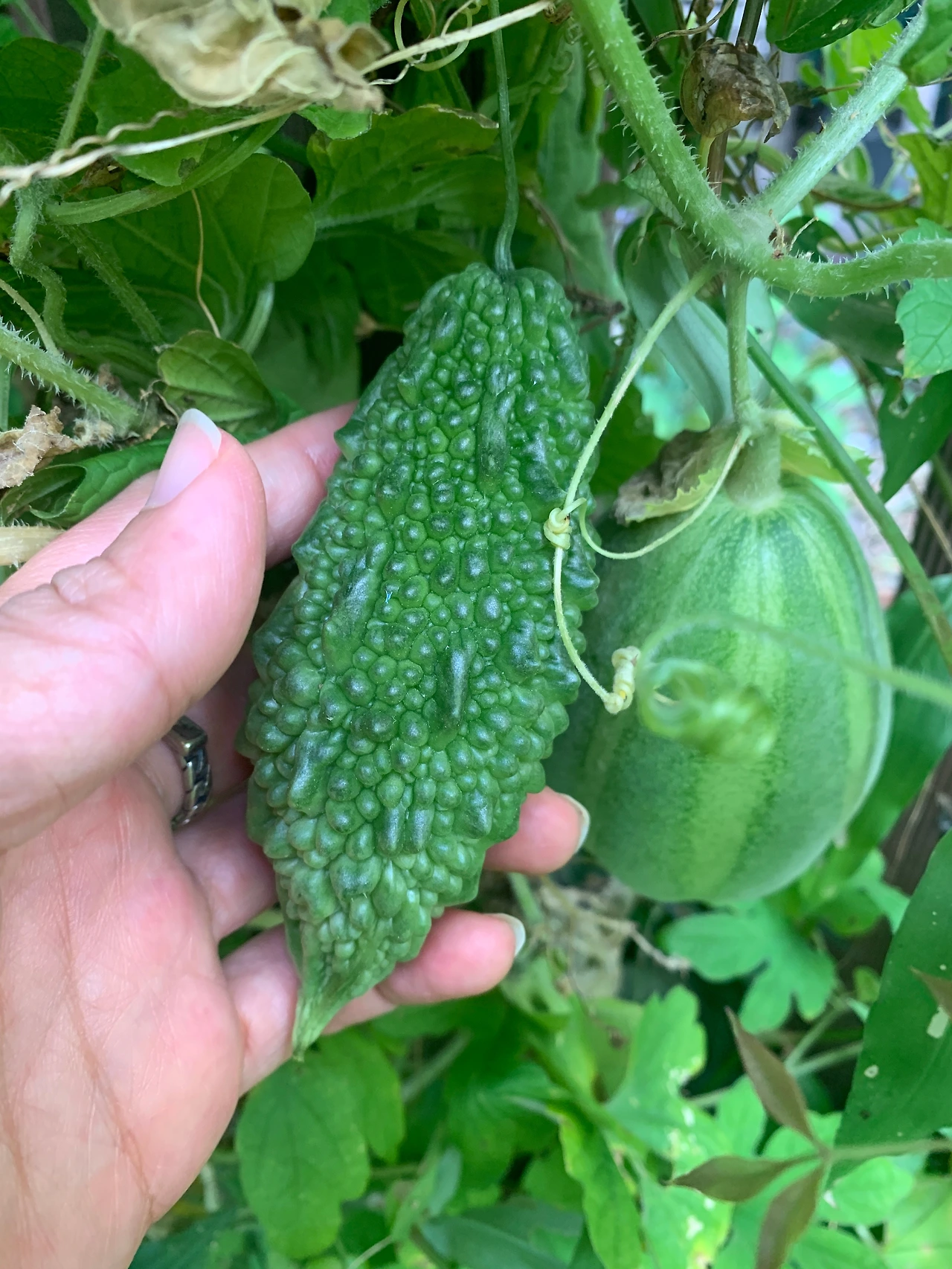 손바닥에 쏙 들어오는 귀여운 참외 두 개, 그리고 그 뒤에 비밀스럽게 여주 하나가 숨어있었다.