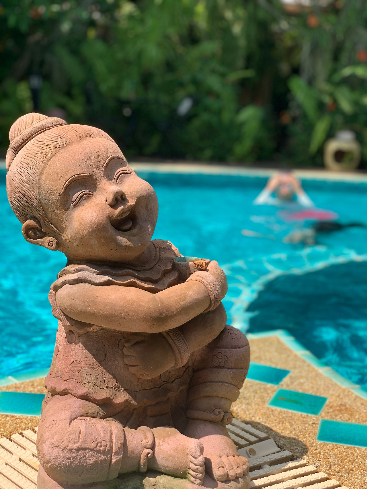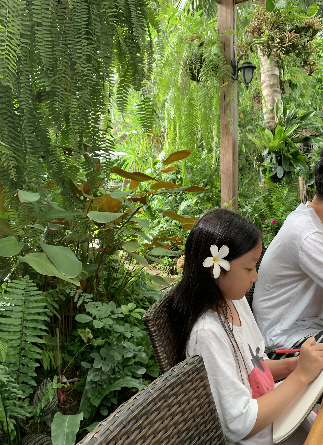 방콕에 있는 손자 생각이 계속 나셨던 주인 할머니는 우리 가족이 마치 진짜 가족인 것처럼 관심을 가져주셨다. (공교롭게도 며느리가 타이항공 승무원이었다는!) 작은 카페 리조트였지만 십여 년 비행하는 동안 머물렀던 그 어떤 호텔 숙소보다 아름다운 정원과 따뜻한 직원들의 배려 덕분에 우리 가족은 3 주내 내 이곳이 내 집인 듯이 살았고 직원들과도 무척 친해지게 되었다.