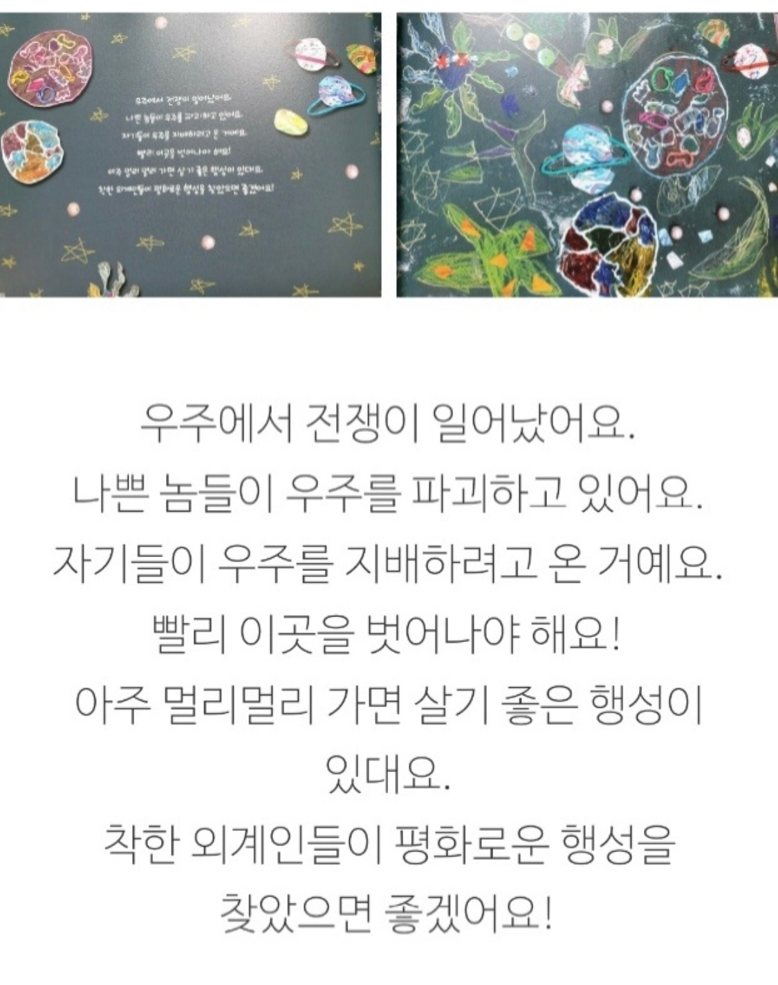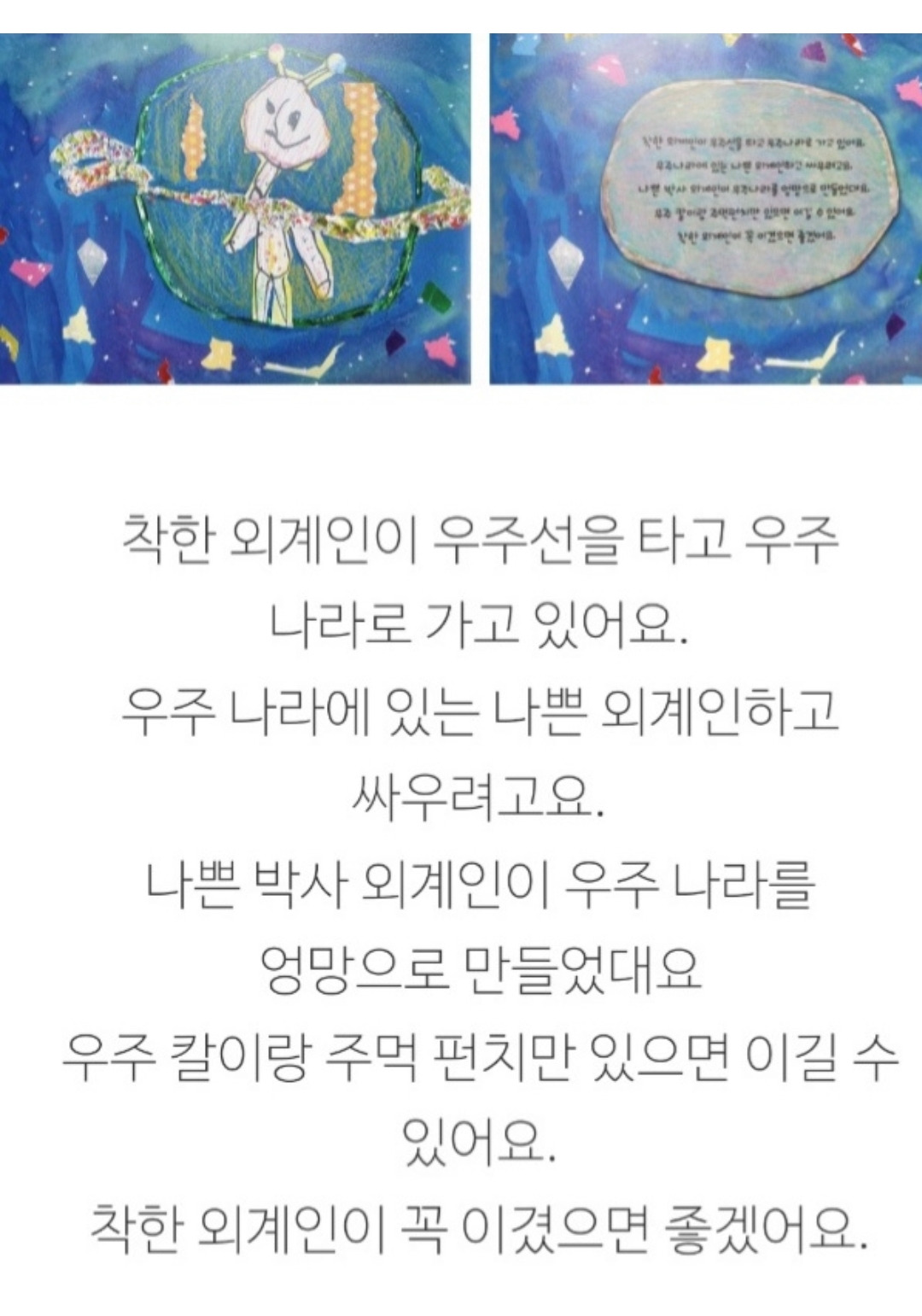 엄마가 쓴 동화를 읽어주니 아이들은 가장 먼저 눈과 귀를 다친 그 외계인들을 크게 걱정했습니다. 그들이 나쁘고 착한가를 따지기 보다 아픈 그들이 제일 걱정이었습니다. 엄마의 상상 속 외계인들은 우리 아이들의 마음속에는 살아있는 사람들이었습니다. 1학년 둘째는 얼른 그들을 낫게 해주자고 제 이야기를 그만하라며 잠깐 멈추게 했고 3학년 첫째는 얼른 별에서 약초를 구해서 먹는다는 이야기를 만들어내자고 아이디어를 냈습니다. 그리고 저는 특별한 약보다 과일과 밥이 보약이라는 내용으로 써서 그들의 눈과 귀가 다 낫게 해주었습니다. 그들이 나아서 서로를 보고 행복해지는 이야기에 아이들은 신나서 거실을 뛰어다녔습니다.