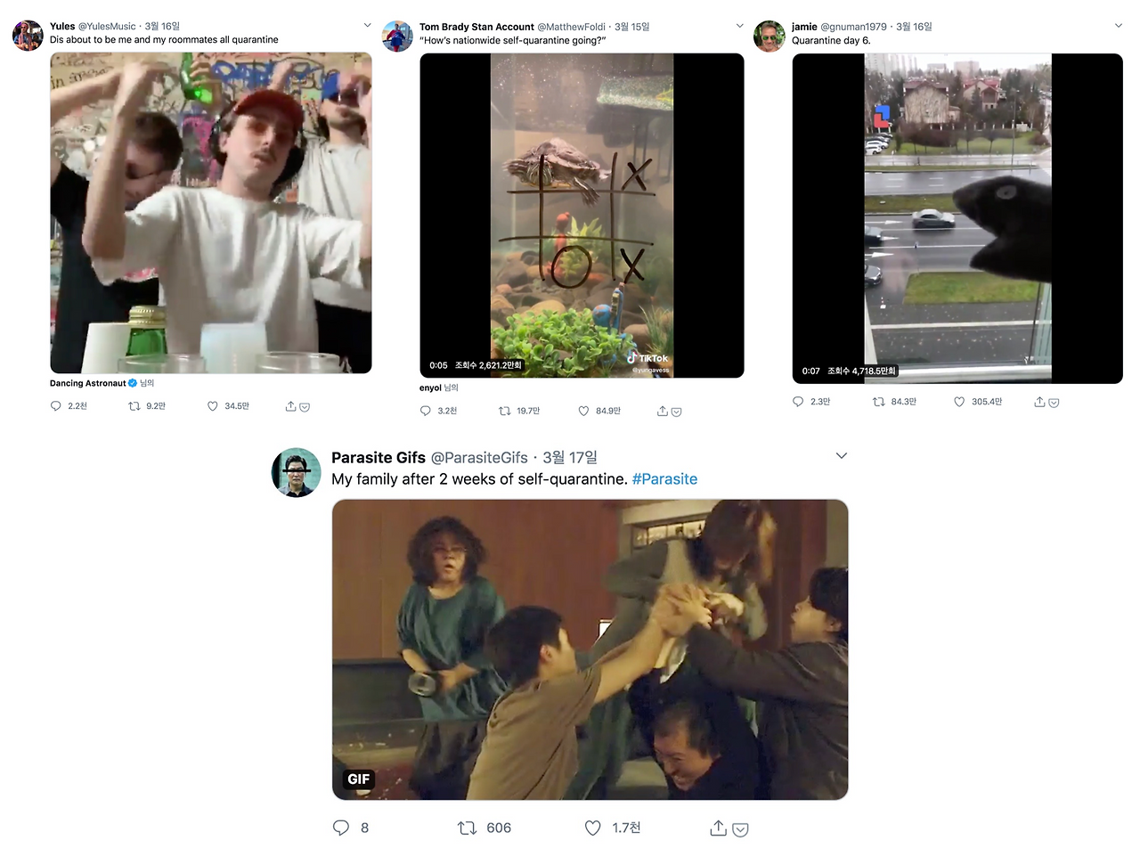 사람들은 늘 그래왔듯 자신의 일상을 사진으로, 비디오로 남기고 있다. 지루함과 외로움 속에서 새로운 자가격리형 엔터테인먼트가 등장했고 소비되는 모양새다. 페스트가 ‘신은 과연 존재하는가’라는 의문에서 르네상스를 일으켰다면, 코로나19는 ‘그럼에도 우리는 울트라 사회적 존재’라는 반발성 깨달음에서 디지털 르네상스를 일으킬지도 모르겠다. 아득하게 멀어보이는 우리의 옛 일상을 언제쯤 되찾을 수 있을까- 디스토피아적인 전망 속에서도 우리가 코로나 블루를 퇴치하는 법. 서로가 만든 짤에 낄낄거리는 와중에 새롭게 피어나는 희망.