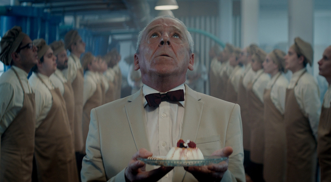식사는 하루에 한 번, 감옥 꼭대기층에서 내려오는 거대한 식탁인 ‘플랫폼’을 통해 주어진다.