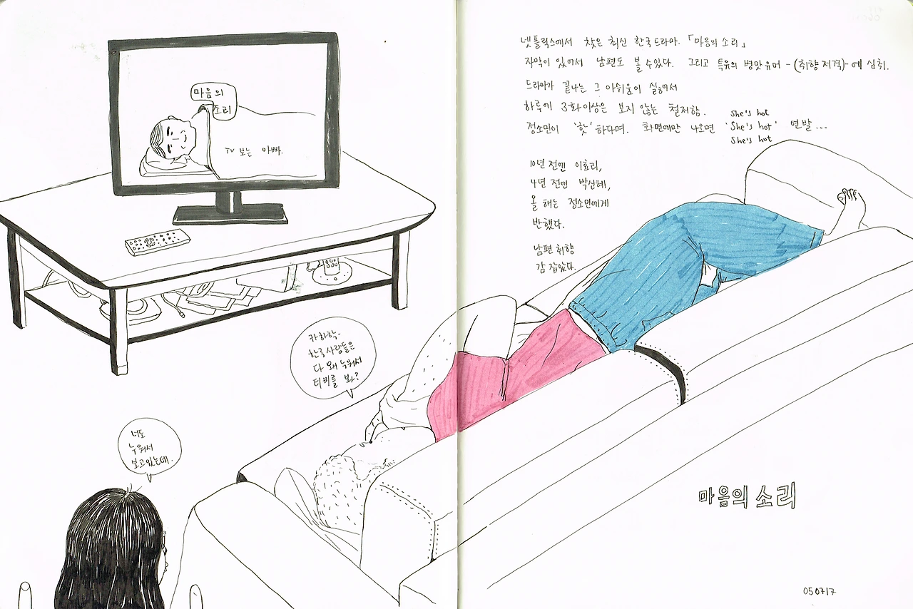 티브이에 넷플릭스가 나와서 좋은 점은, 혼자 인터넷으로 찾아보던 한국 드라마를 화면이 크고 자막을 굳이 내가 찾지 않아도 되는 편리함에- 남편과 같이 볼 수 있다는 것. 그렇긴 해도 선택지가 그다지 많지는 않다. 내가 모르겠는 드라마가 많아서 뭘 봐야 할지 모르겠다. 리모컨을 한참 만지작 거리다 우연히 찾은 것이 이광수가 나오는 웹툰이 원작인 '마음의 소리'. '무한도전'을 못 알아들으면서도 보던 사람이라 그런지 시작부터 똥 에피소드로 시작하는 병맛 유머 드라마를 무척 좋아했다. 더불어- 살짝 돌아이 캐릭터로 나오는 정소민이 예쁘다며 싱글벙글. 한국에 처음 방문했던 2008년에는 소주 모델을 하던 이효리에게, 내 동생 결혼식 때문에 방문했던 2013년에는 '상속자들'에 나오던 박신혜에게, 올 해는 정소민에게 빠졌다. 뭔가 비슷한 인상인 이들의 공통점이 뭘까... 곰곰이 생각하다 보니 다들 귀엽게 눈웃음을 친다. 남편 마음의 소리.