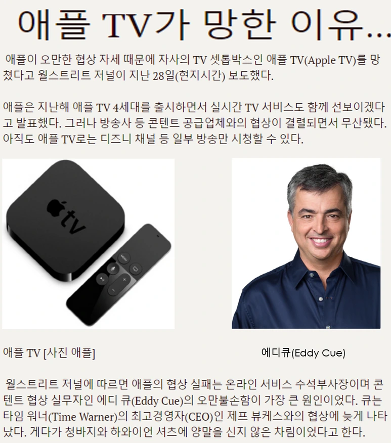 월스트리트 저널에 따르면 애플의 온라인서비스 수석 부회장이며 콘텐츠 협상 실무자인 에디 큐(Eddy Cue)의 오만불손한 태도가 애플TV의 실패에 일조했다고 보도했다. 그는 타임워너 최고 경영자인 제프 뷰케스와의 협상에 청바지와 하와이언 셔츠차림, 양말을 신지 않은 샌달 차림으로 나타났다고 한다. 통상적인 비즈니스 매너라고 볼 수 없다. 게다가 결정적이었던 것은 약속시간에 늦게 나타난 것이었다. 비즈니스 미팅에 있어서 결코 해서는 안 될 실수를 한 것이다.