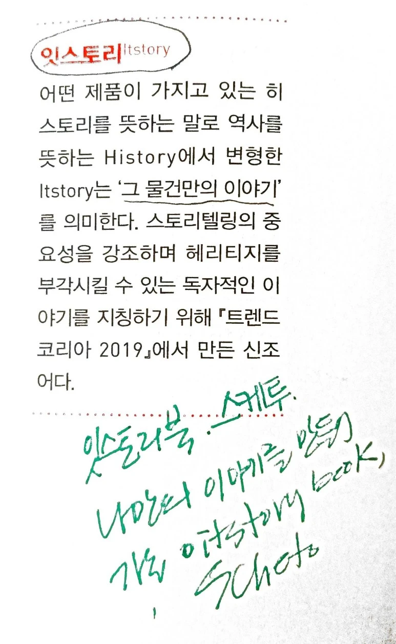 또 전통(heritage)를 담아낸 독특한 '잇스토리(itstory)'(②)로 소비자들의 구매 심리를 자극하며 소비의 명분을 만들어 줘야 한다.