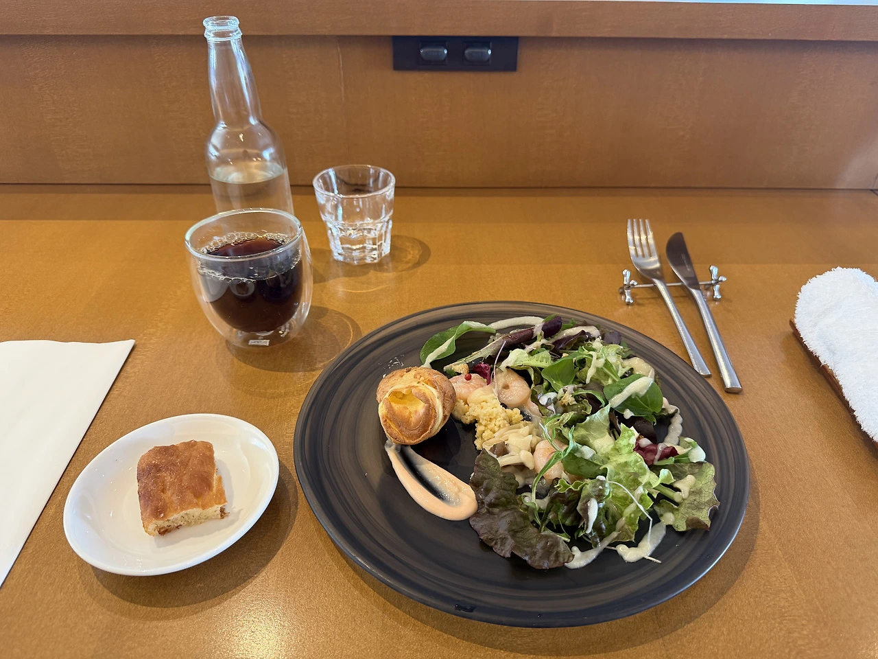 간단히 커피와 디저트로 끼니를 때우려 했으나 내가 방문했던 12시 30분경은 차 또는 커피만 마시거나 식사만 할 수 있어 어쩔 수 없이 본격적인 브런치를 하게 되었다. 결과적으로는 잘된 일이었다. 이곳에서 보이는 풍경이나 공간적인 멋스러움뿐만 아니라 식사의 질 또한 굉장히 높았기 때문이다. 점심은 샐러드와 메인 메뉴(갈레트 또는 파스타), 음료가 나오는 일종의 세트 메뉴였는데, 샐러드와 식전빵을 먼저 제공하고 샐러드를 다 먹고 나면 메인 메뉴를 서브하는 방식이니 미니 코스라고 봐도 무방하다. 샐러드가 먼저 나왔을 때, 식기는 물론이고 샐러드의 재료와 소스의 플레이팅까지 훌륭했다. 식전빵과 함께 샐러드를 먹으며 메인 메뉴로 선택한 갈레트 또한 훌륭한 비주얼과 맛일 거라고 짐작할 수 있었다.