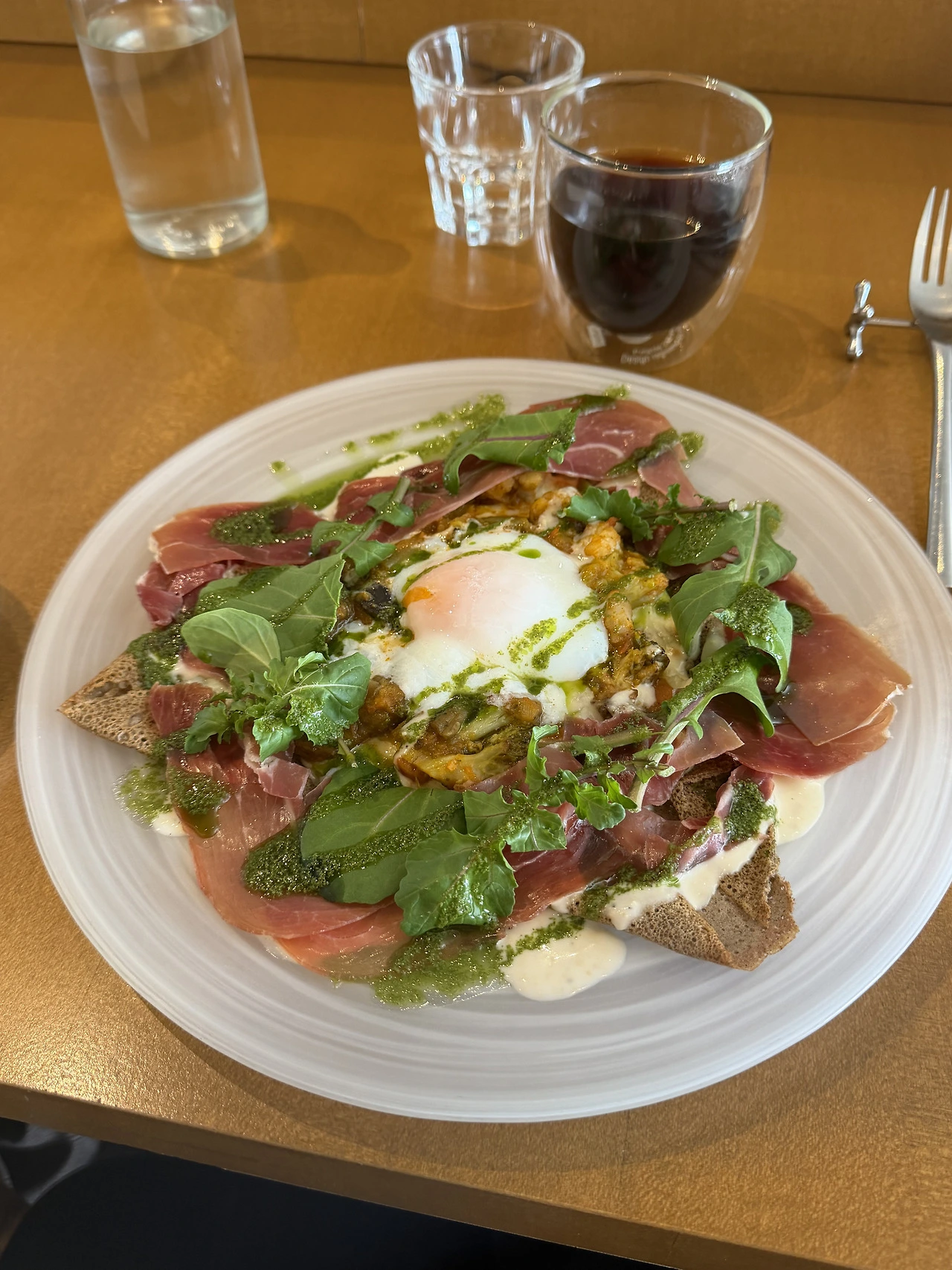 과연 갈레트 또한 비주얼과 맛이 모두 좋았다. 샐러드의 경우 검은 접시에 담아 기존 샐러드가 가진 이미지보다 무겁게 연출한 듯했고, 메인 메뉴인 갈레트는 반대로 흰 접시에 담았다. 전채 요리와 메인 메뉴의 밸런스를 맞추어 서브를 받는 고객 입장에서 코스 요리라고 느낄 만한 지점이 아니었나 생각했다. 이 시리즈의 (프롤로그를 제외한) 5번째 글에서도 언급했듯 나는 미식가도 아니고 평소 파인다이닝을 즐기지도 않지만, 그런 나라도 충분히 이렇게 셰프나 가게의 의도를 생각해 볼 법하게 곳곳에서 디테일이 느껴졌다.