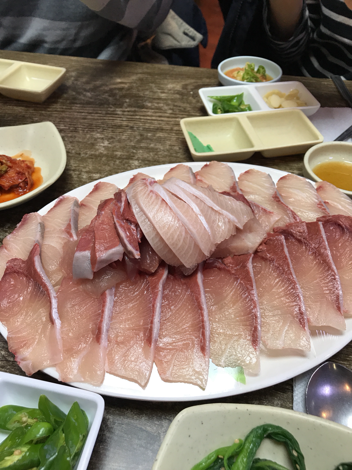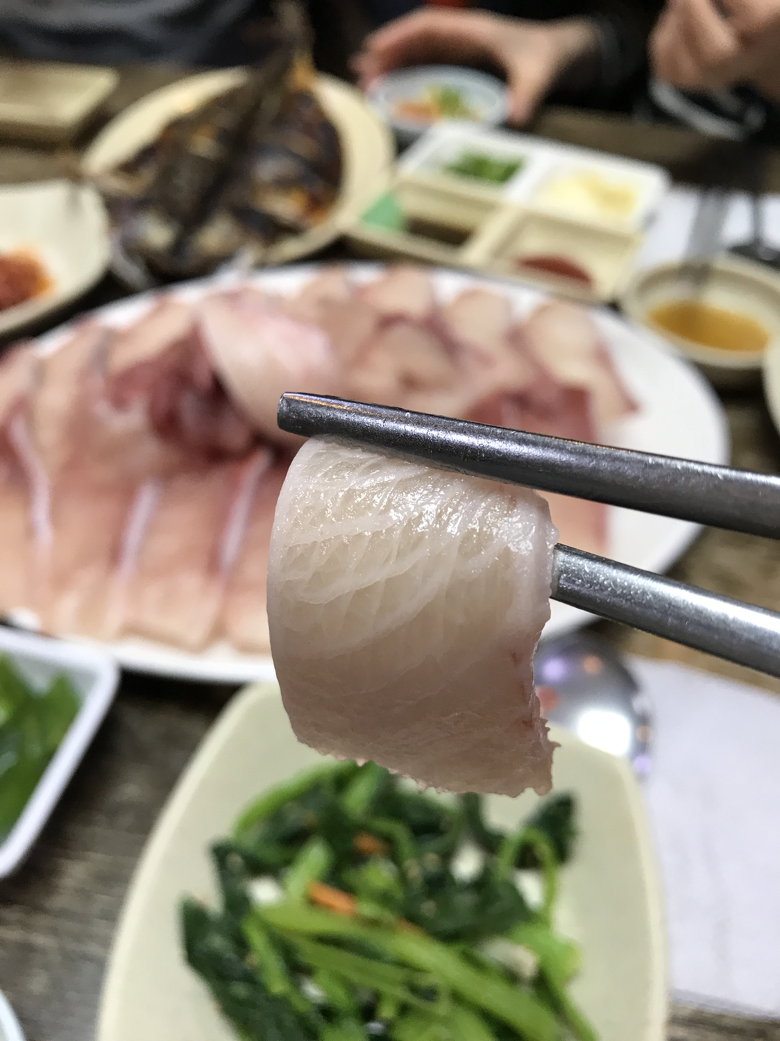 오직 대방어회 하나 먹으려고 1시간 넘는 거리인 모슬포까지 왔다. 대기표를 받아 기다리고.. '특대방어회'를 시켰다. 스끼다시가 좋은 횟집은 아님. 대방어가 있으니 다른 것은 다 필요 없는 것이다. 활어회보다는 숙성회, 회보다는 스시를 더 좋아하긴 하는데 대방어는 진리였다. 흰 부분은 광어의 대뱃살처럼 고소하고, 붉은기 있는 부분은 붉은살 생선마냥 기름지면서도 느끼하지 않았다. 회 먹다보면 질려서 초장을 찍어먹게 되는데, 처음부터 끝까지 초장은 필요하지 않았다. 대방어 맛은 알아버렸고. 2,3월에는 부시리가 맛있다고 하니 그때 또 ...