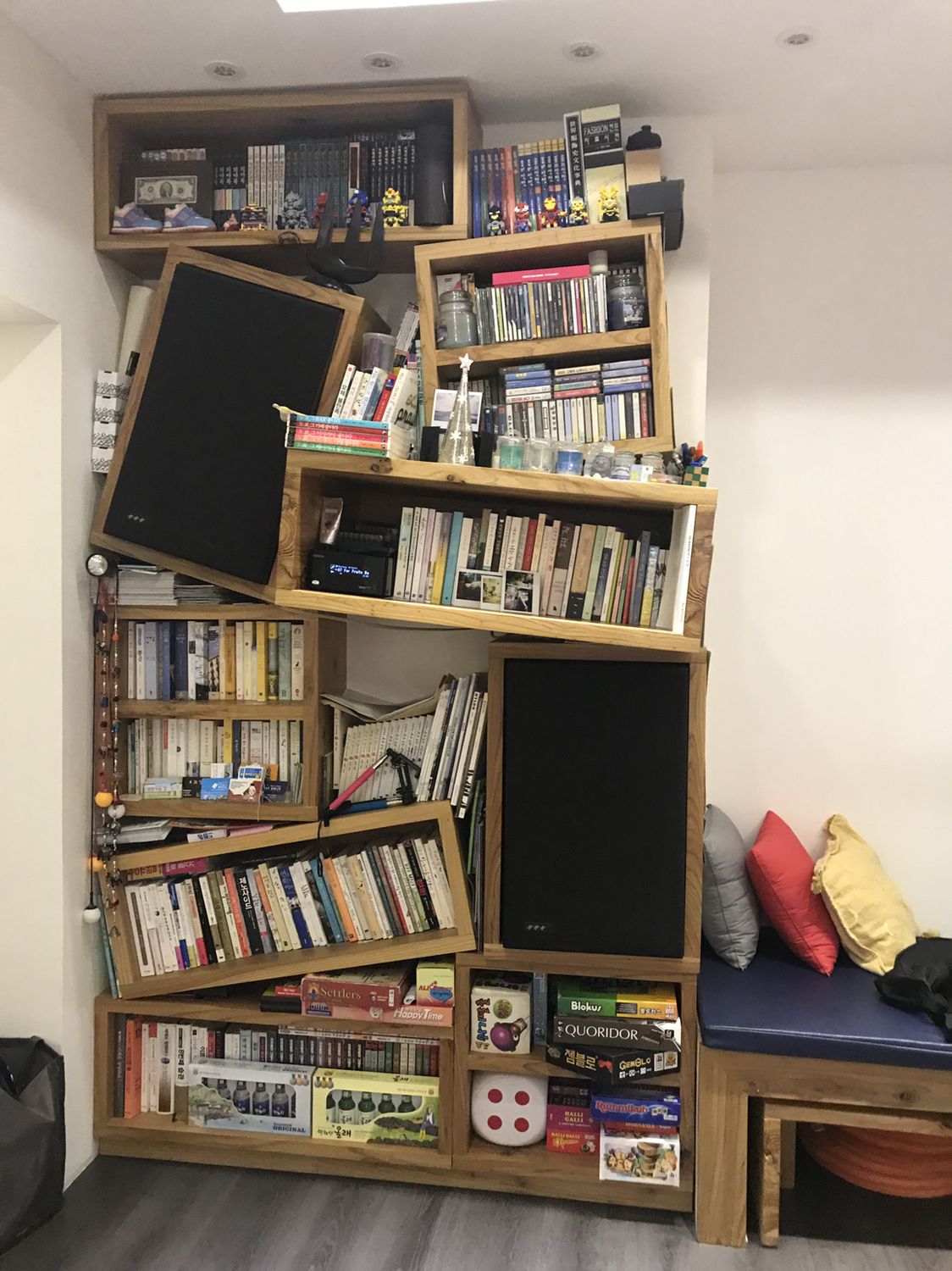 2층 공용공간엔 책장이 아주 멋지게 쌓여있다. 그 사이에 jbl 스피커도..(트위터에 문제가 있는지 살짝 지직댐). 볼만한 책도 꽤 있고, 보드게임도 있었는데 못해봤다.