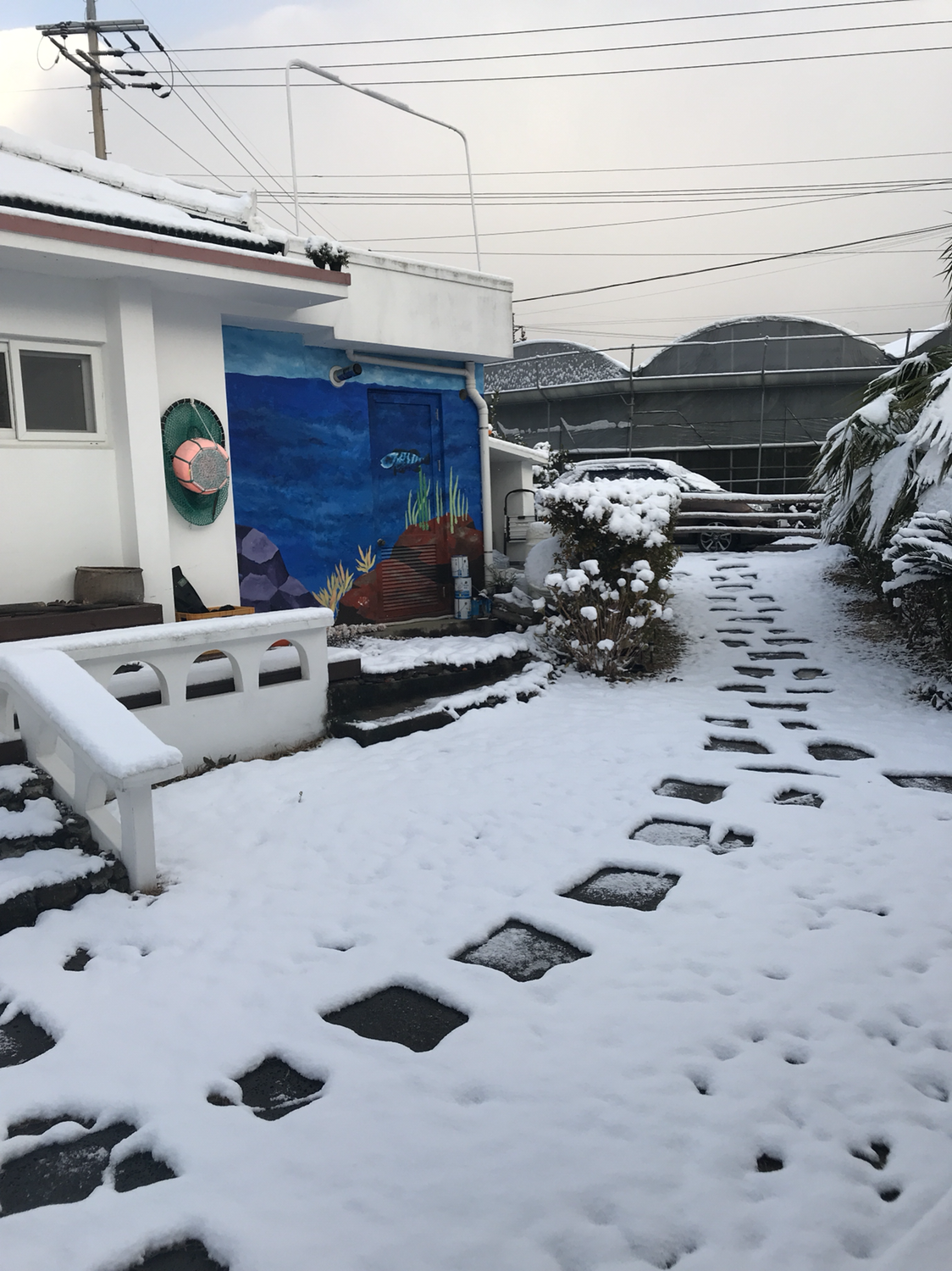 해녀/해남 부부가 하는 홈스테이(독채). 깔끔하고 조용해서 좋았다. 둘째날 아침 커튼을 열자마자 눈이 쌓여있는 풍경이 환상적이었음.