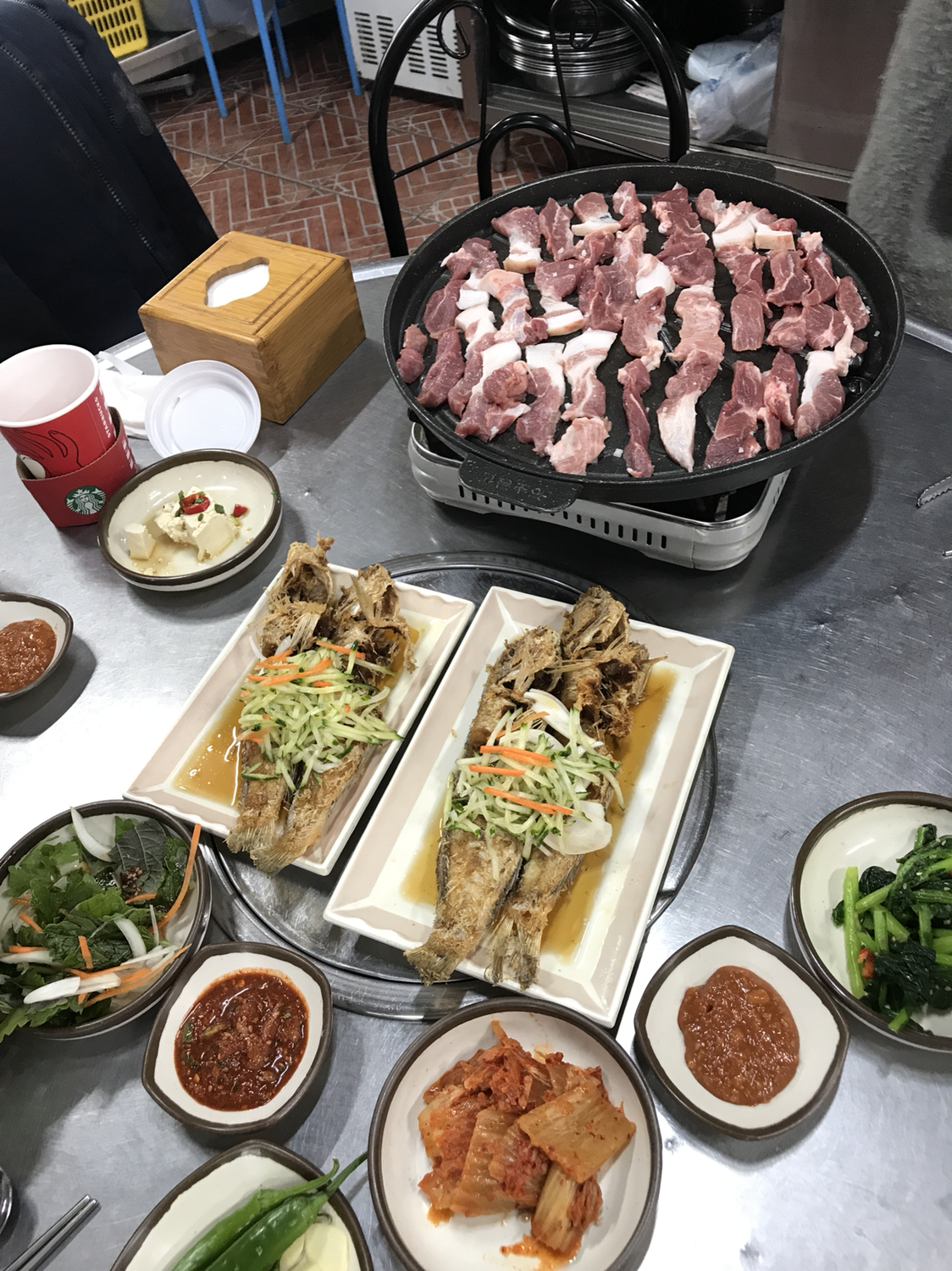7,000원에 돼지 전지 구이 + 옥돔튀김이 나온다. 돼지고기는 보통이였고, 옥돔 튀김이 너무 맛있었음. 가족여행때 옥돔구이를 먹고 고등어 시킬걸.. 하며 후회했었는데, 7,000원짜리 정식에서 이런 맛을 보다니.. 놀라웠다.