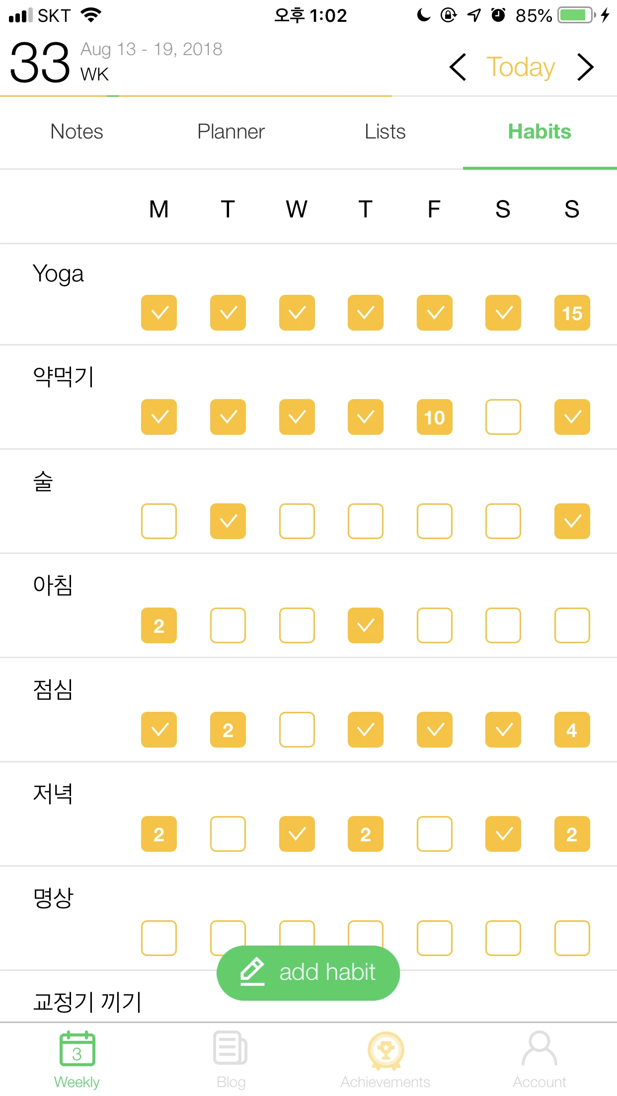 습관 목록을 간단하게 등록하고, 기록할 수 있습니다. 전체 습관을 weekly view로 확인할 수 있고 특정 습관만 보고 싶을 땐 monthly로도 볼 수 있습니다.