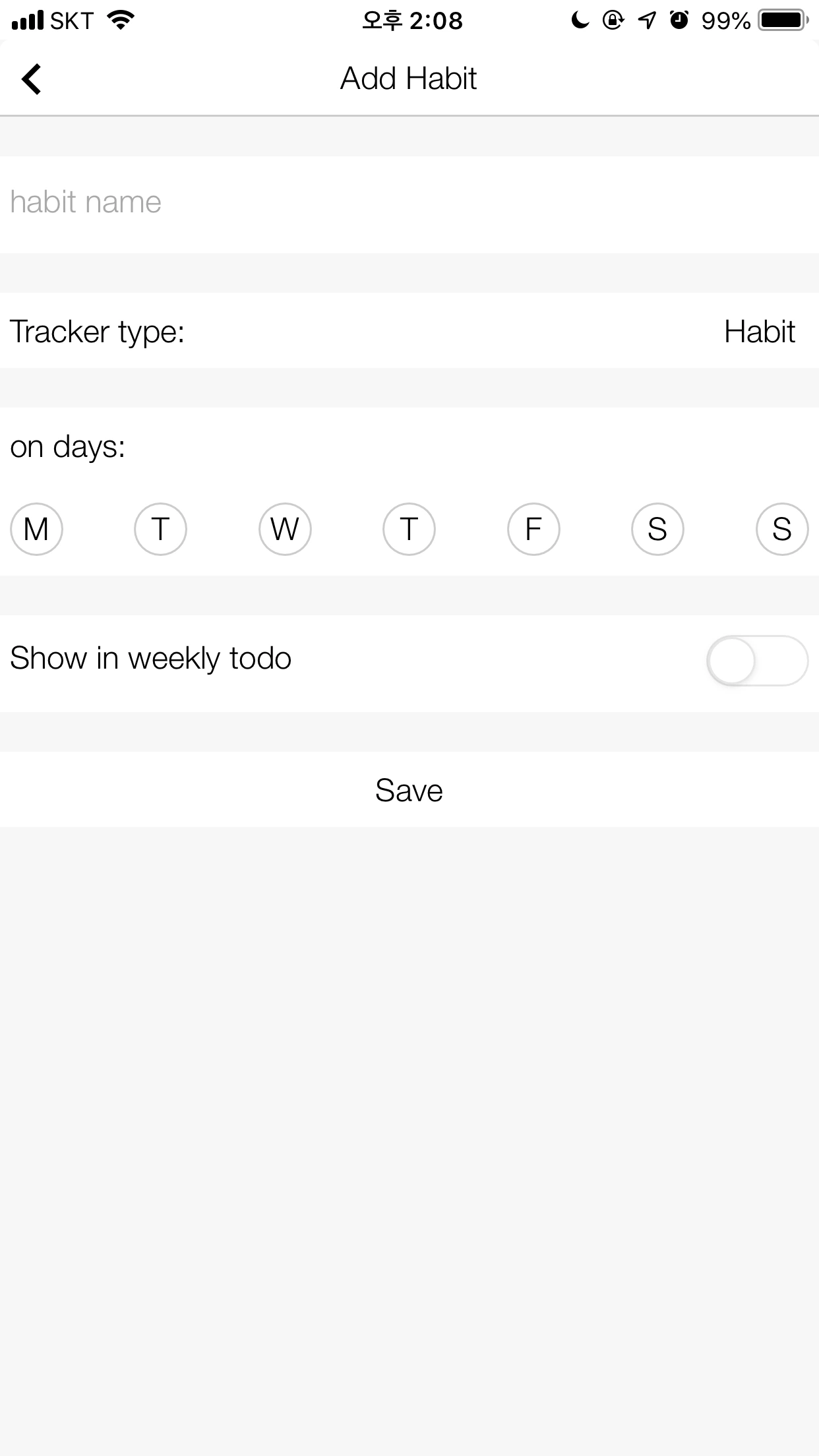 마지막 스크린샷은 습관의 등록 화면입니다. 이름만 등록하면 별다른 설정은 해주지 않아도 됩니다.