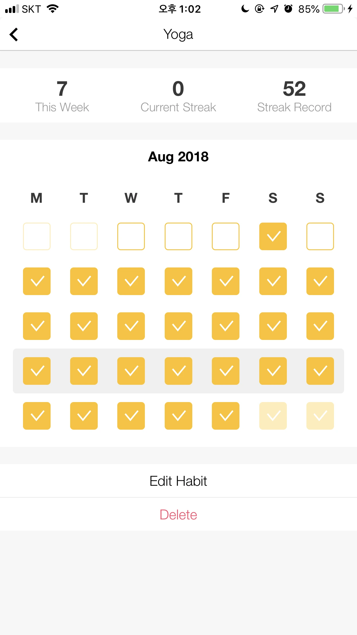 특정 습관을 monthly로 보고 싶은 경우 습관 목록 좌측의 습관 이름을 클릭하면 됩니다. 월간으로 진행 상황을 볼 수 있죠 (52일 연속으로 요가를 했었네요, 과거의 나, 아주 칭찬해~ ).