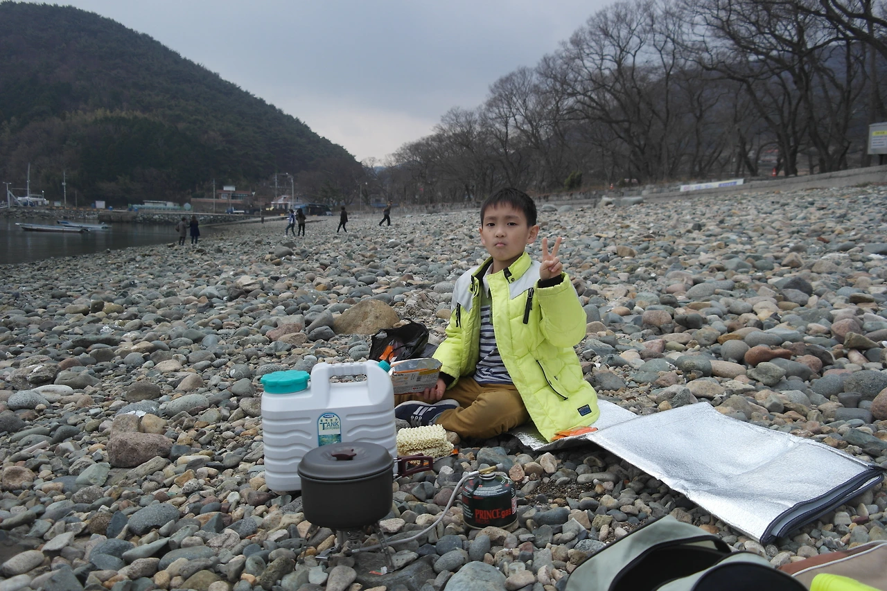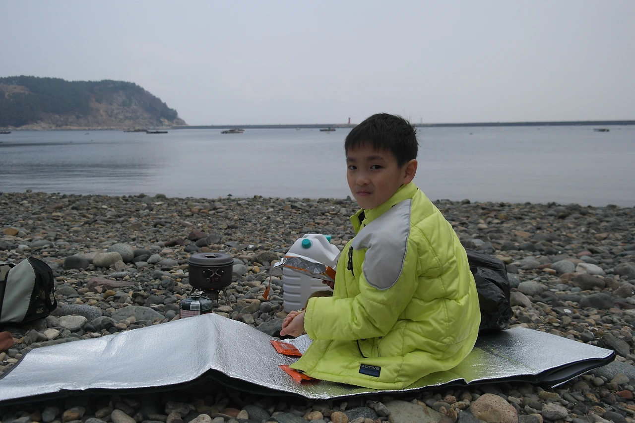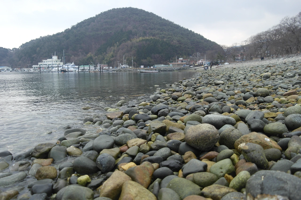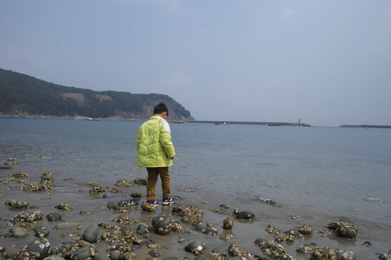 라면을 먹은 후 깨끗이 정리하고 아이 손을 잡고 몽돌 해변을 거닐어 봅니다.