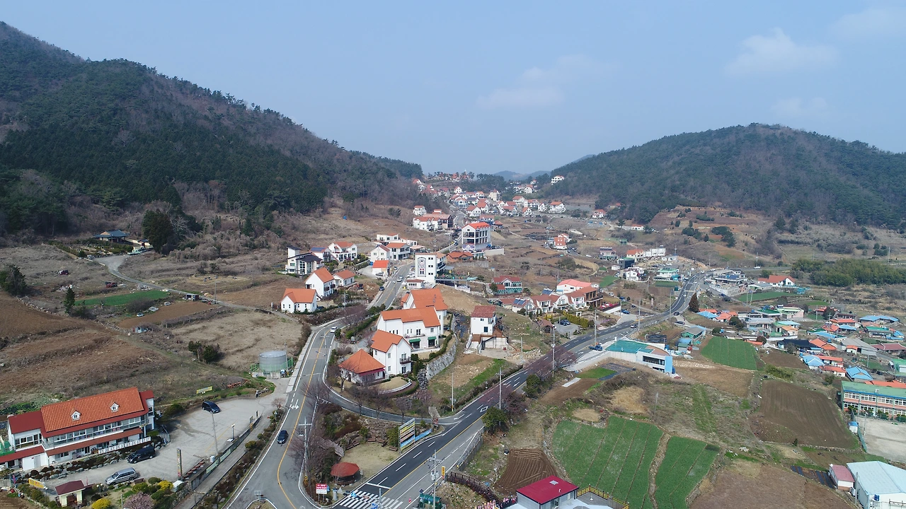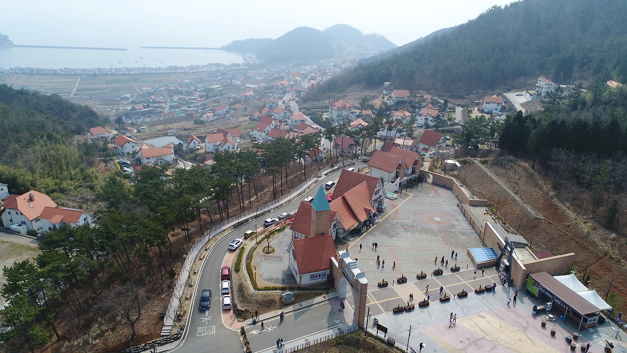 주차장에서 물건 어부림 쪽으로 내려다본 독일마을의 풍경입니다.