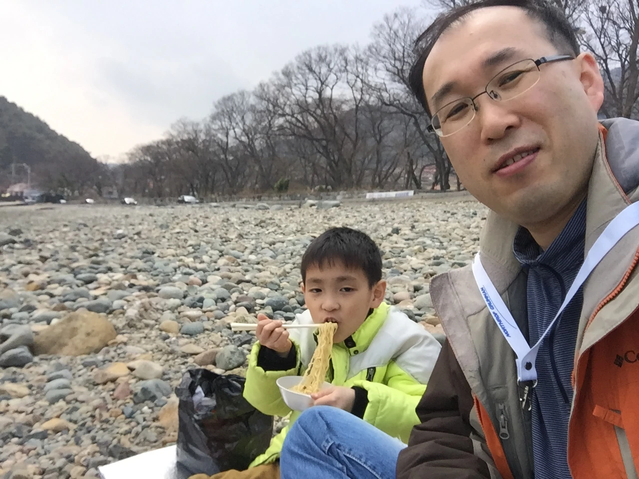 오늘은 아이와 밖에서 라면을 끓여 먹기로 작정을 하고 나왔습니다.
