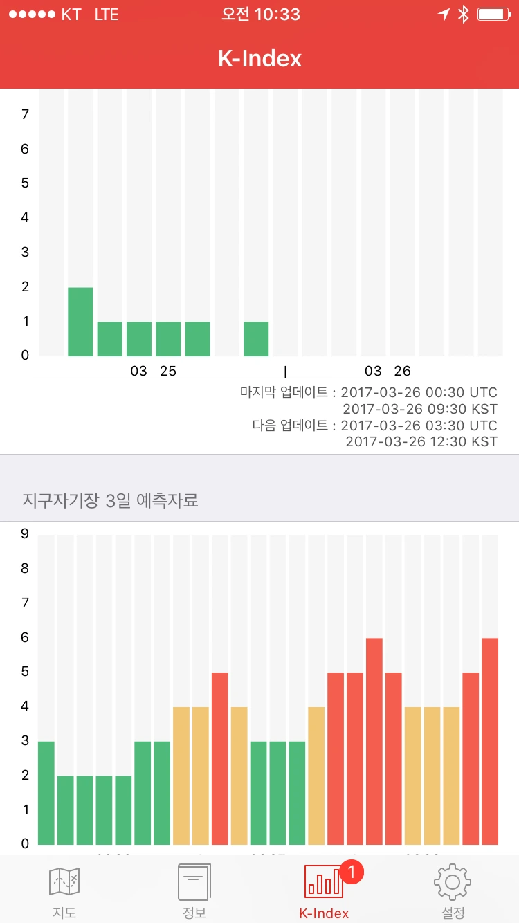 독일마을 정상의 주차장이라서 그런지 바람은 지수보다 더 많이 부는 것 같네요. 다른 사항은 딱히 문제가 될 것은 없어 보입니다. 지자기(K-Index) 예보는 높게 나왔는데 현재 지자기 값은 높지가 않네요.