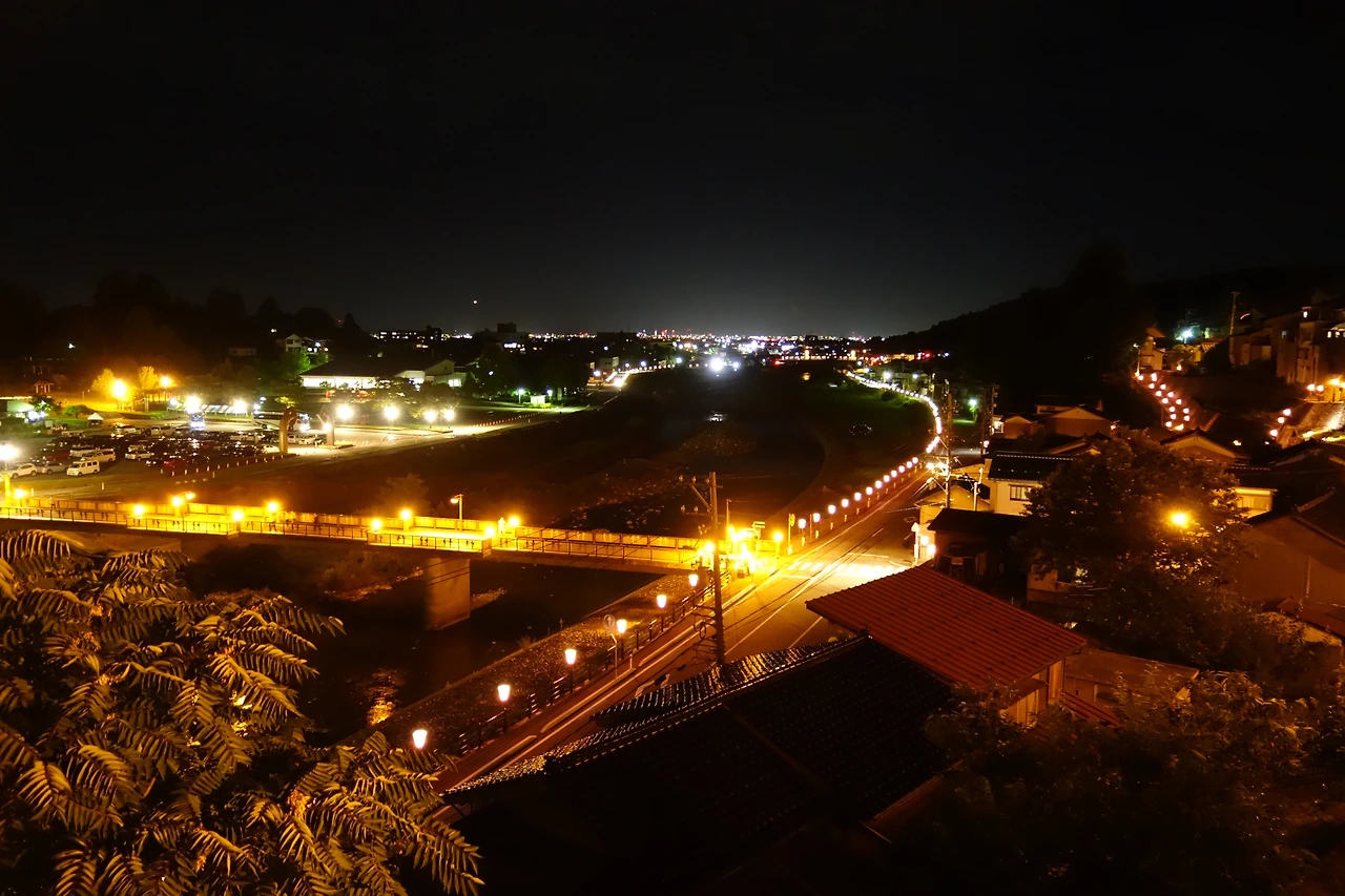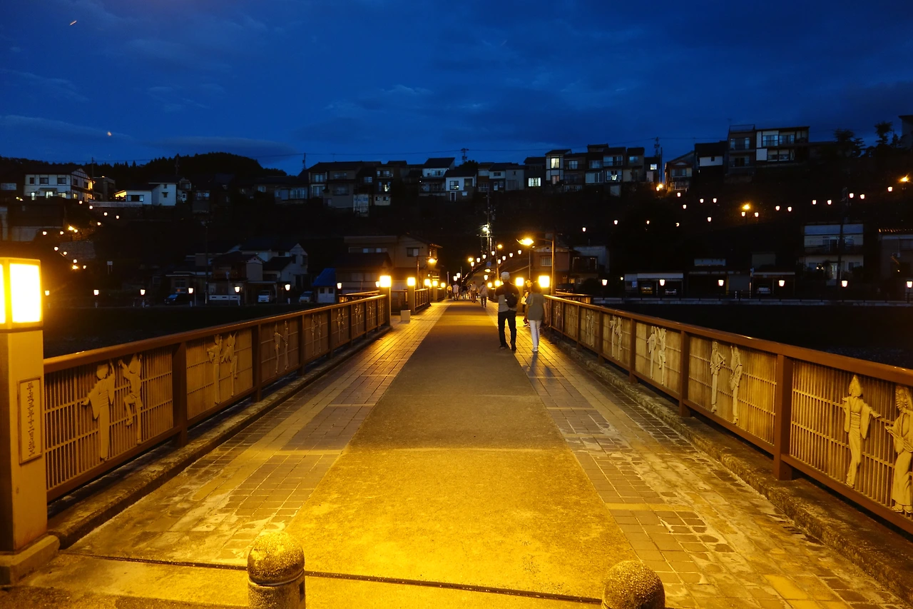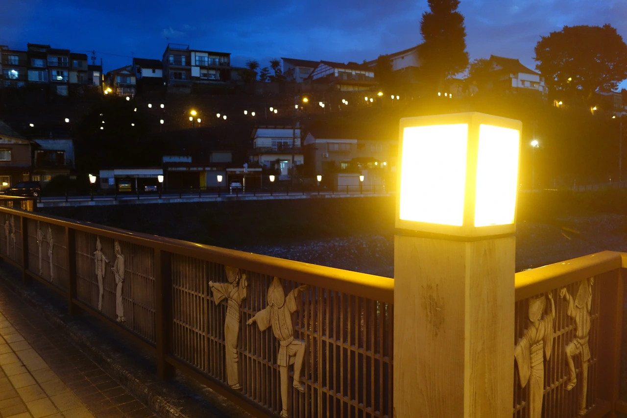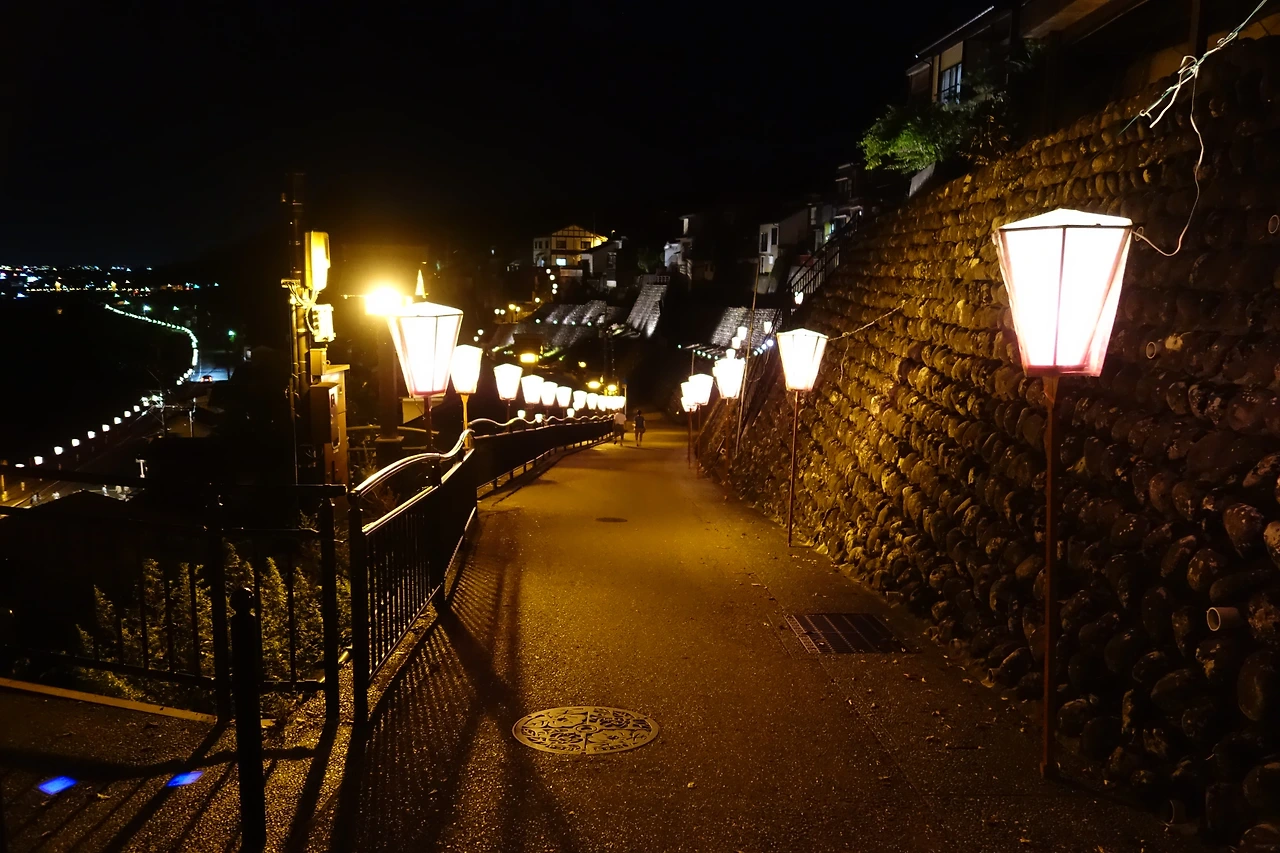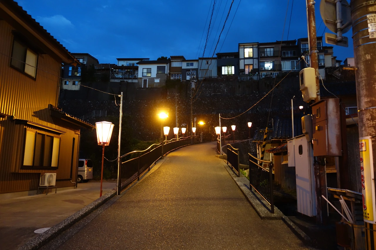 구경을 다 마치고 돌아갔던지, 아니면 슬슬 돌아가야 한다고 생각해서 돌아갔던지는 기억이 잘 나지 않는다. 여하튼 이제 돌아가야겠다 싶어 왔던 길을 그대로 돌아가 역으로 가려 했다. 비탈길을 올라오던 곳에 다시 왔는데, 완전히 밤이 된 마을의 가로등이 주황빛으로 빛났다. 도야마 쪽 반짝이는 도시의 불빛은 더욱 선명해져 있었다.