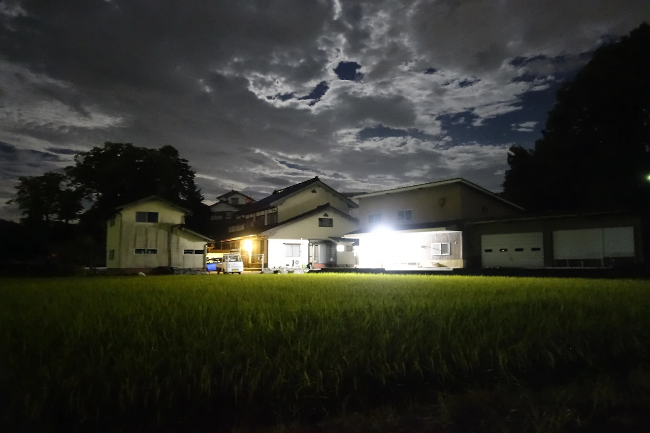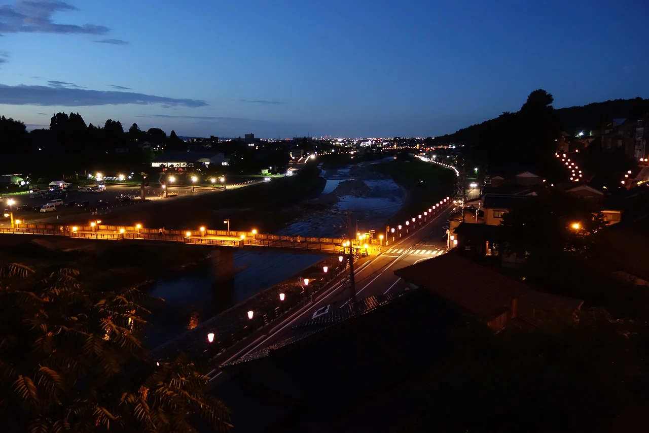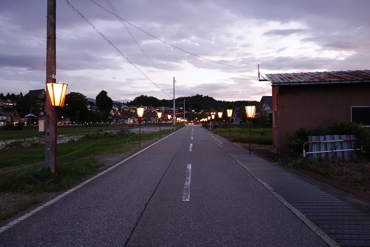 다리를 건너고 나니 앞쪽에 있는 마을의 위쪽으로 가는 비탈길이 나왔다. 높지 않은 비탈길을 천천히 따라 올라서 돌아보니 하늘은 더 짙게 어두워져 있었다. 그 아래로 개천이 흐르고, 주위로 소박한 마을이 펼쳐져 있었다. 저 멀리 반짝이는 큰 도시도 보였는데, 아마 도야마 쪽 도시였던 것 같다. 완전히 밤이 찾아오기 직전의 풍경이 멋져서, 잠시 그 모습을 바라봤었다.