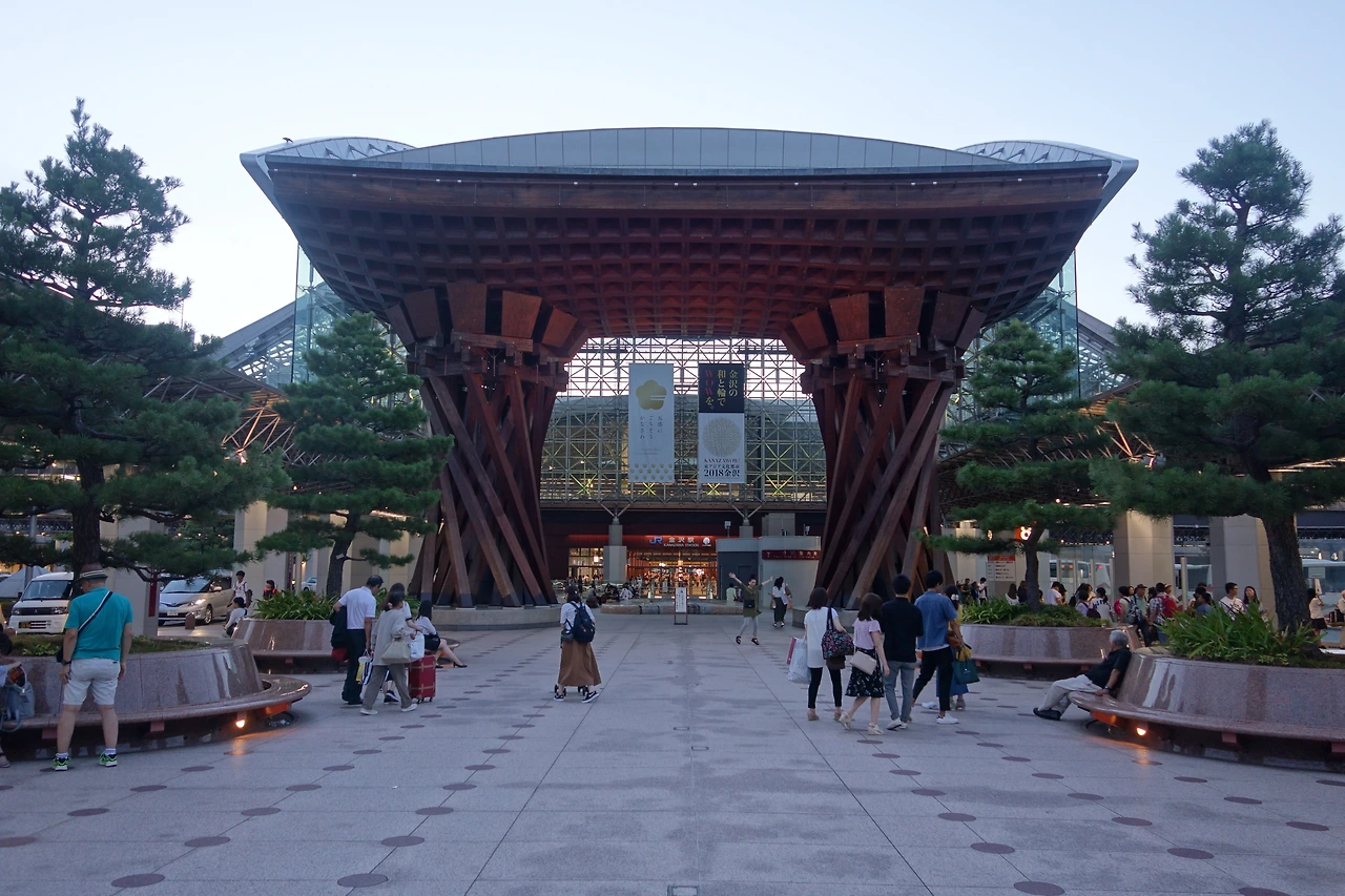 역에서 조금 떨어진 곳에 있는 게스트하우스에 체크인을 하고 짐을 풀어둔 뒤 가나자와 역으로 향했다. 역 앞에는 나무로 복잡하게 쌓아 올린 거대한 문이 있었는데, 이 구조물이 가나자와의 유명한 상징물인 듯 했다. 많은 사람들이 사진을 찍는 사이 나도 문 사진을 찍고, 다른 사람 사진을 찍어 주기도 하면서 J 를 기다렸다.