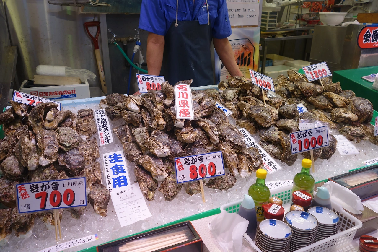 시장 구경을 하다 보면 다양한 식재료들을 볼 수 있는데, 이런 것들을 보면 그 나라의 문화와 지리적 특성을 아는데 도움이 되기도 한다. 가나자와의 오미초 시장에서는 좌판에 굴을 쭉 깔아 두고, 사고 나서 그 자리에서 까먹을 수 있게 준비해 둔 것이 있었다. 나는 한국에서 그런 것을 본 적은 없었기에 꽤 신기했다. 내가 굴을 좋아하지 않아 먹어보지 못했지만, 굴을 좋아한다면 꼭 먹어보았을 것 같다.