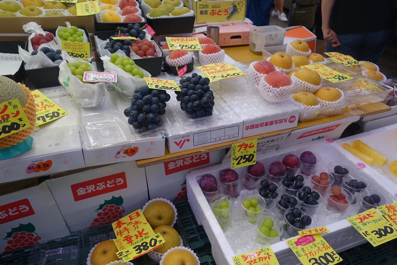 시장 가는 길, 저 멀리서 여자 두 명이 걸어오는데 자세히 보니 어디선가 본 것 같다. 알고 보니, 어제 가나자와 역 앞 구조물에서 사진을 찍어 줬던 사람들이다. 모른 척 하고 지나가긴 애매하고, 상대방도 나를 본 것 같아서 인사를 한다. 어제 찍은 사진 나중에 보내 줄께 하고 돌아서는데, 둘이서 손에 작은 컵을 하나씩 들고 있다. 컵 안에는 다 먹은 포도의 송이가 들어 있다. 포도알을 먹고 남은 포도 송이가 꽤 커 보였다. 무슨 포도를 저렇게 컵 안에 작게 담아서 팔까 생각했었다. 잠시 후 나도 들게 되었지만 말이다.