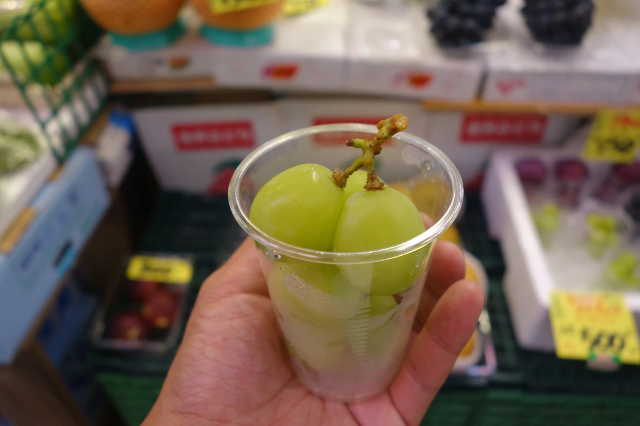 구경을 하다 보니 과일 가게도 있었는데, 다양한 과일 중에 단연 내 눈길을 끄는 것은 작은 과일을 담아 둔 컵들이었다. 한 컵에 5000 원 정도의 부담없는 가격으로 과일을 맛볼 수 있게 되어 있었는데, 그중에 가장 시선이 가는 것이 있었다. 엄청나게 큰 청포도였다. 내가 알고 있던 한국의 포도나 수입 청포도보다 훨씬 큰데, 알도 굵은데다가 은근히 광택이 나는 것이 잘 익은 사과의 겉에서 나는 빛 같은 것이 보였다. 사실 포도가 크면 포도지 뭐 얼마나 맛이 있을까? 하는 생각으로 한번 맛이나 보자는 생각에 한번 사 먹어 보았다. 그리고 그것이, 내가 처음 먹어 본 일본의 샤인머스캣이었다.