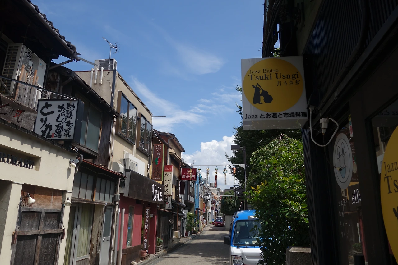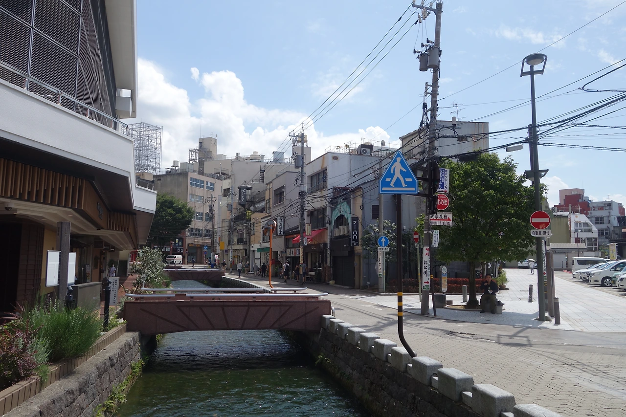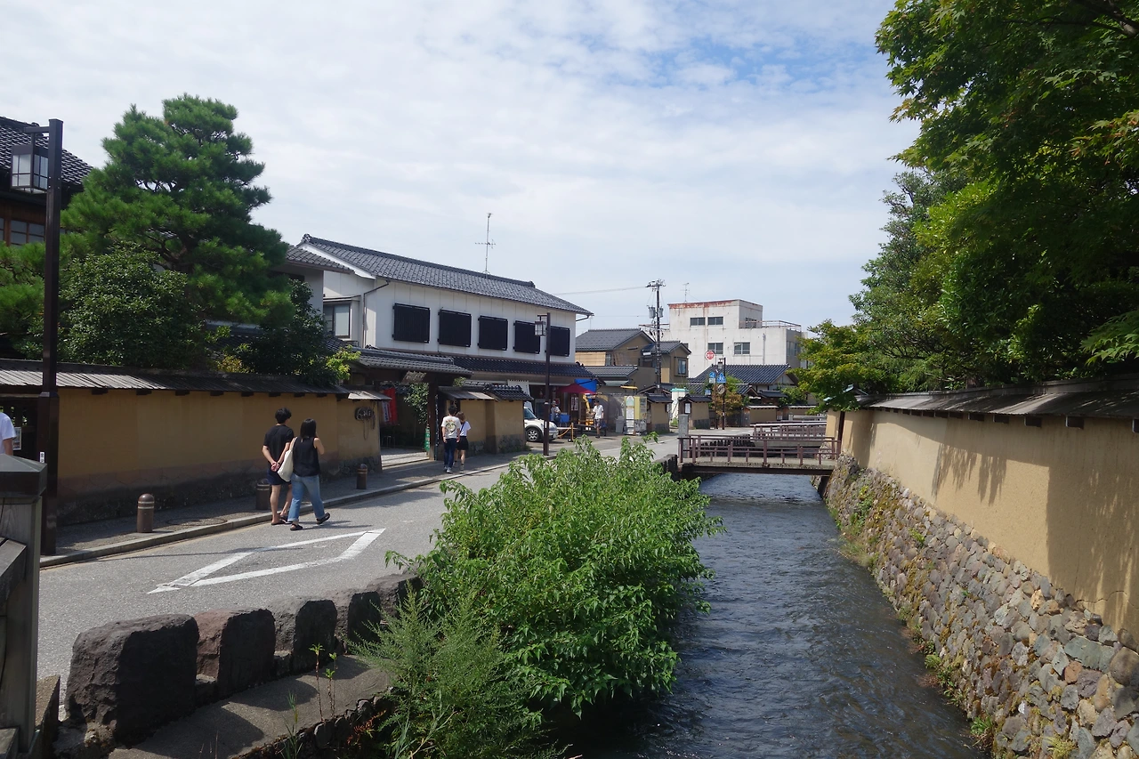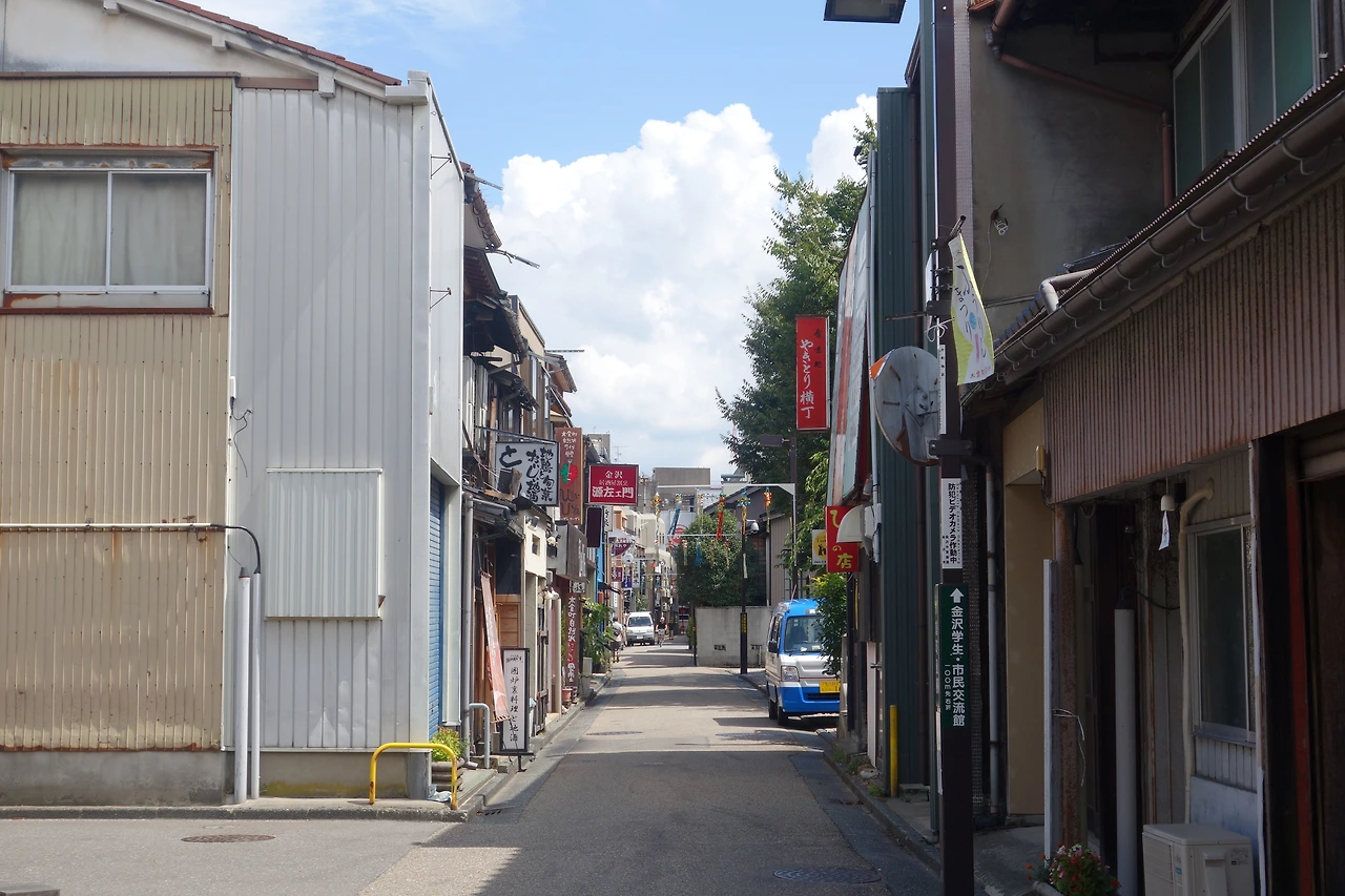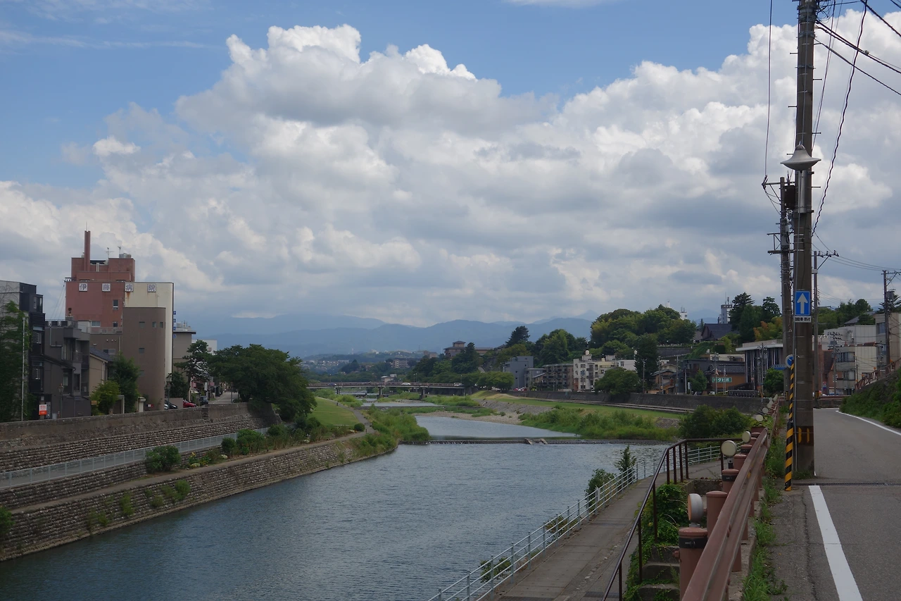 물건을 모두 사고 나서 밖에 나와 조금 걸으니 아까에 비해 현대적인 골목을 지나게 되었다. 낮 시간대라 그런지 대부분의 가게가 문을 닫았지만 간판과 골목 구경을 하는 것에는 큰 문제가 없었다. 아침에는 조금 흐렸던 날씨가 점점 맑아지며 하늘에 큰 구름이 지나갔다. 좁은 골목길 사이로 보이는 구름과 다양한 간판을 구경하며 걸어가다 보니 다리가 나왔다. 길은 다리를 건너는 길이 아니었지만, 다리 위에서 멋진 광경을 볼 수 있을 것 같아 일부러 건너갔다 왔었다. 다리에서는 가나자와 주위의 산과 구름이 잘 보였다.