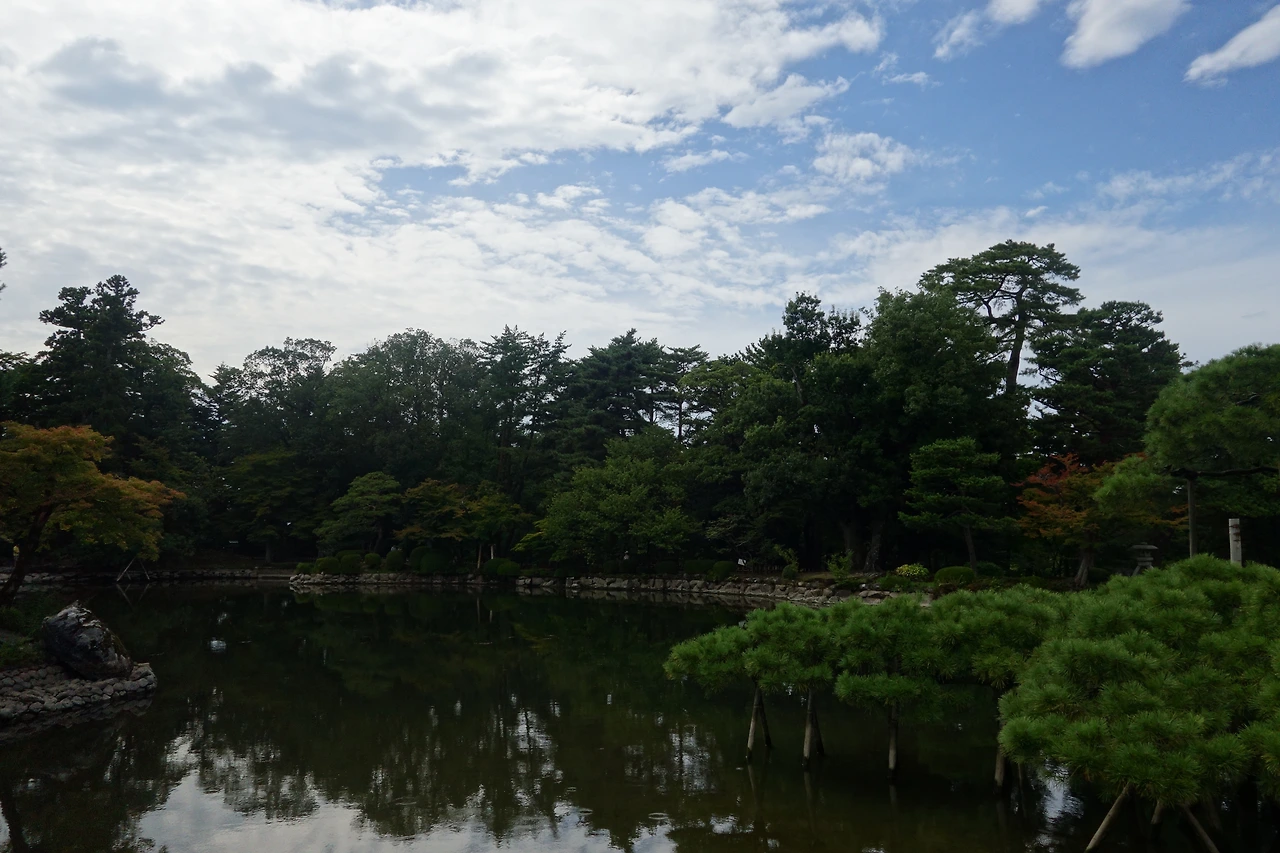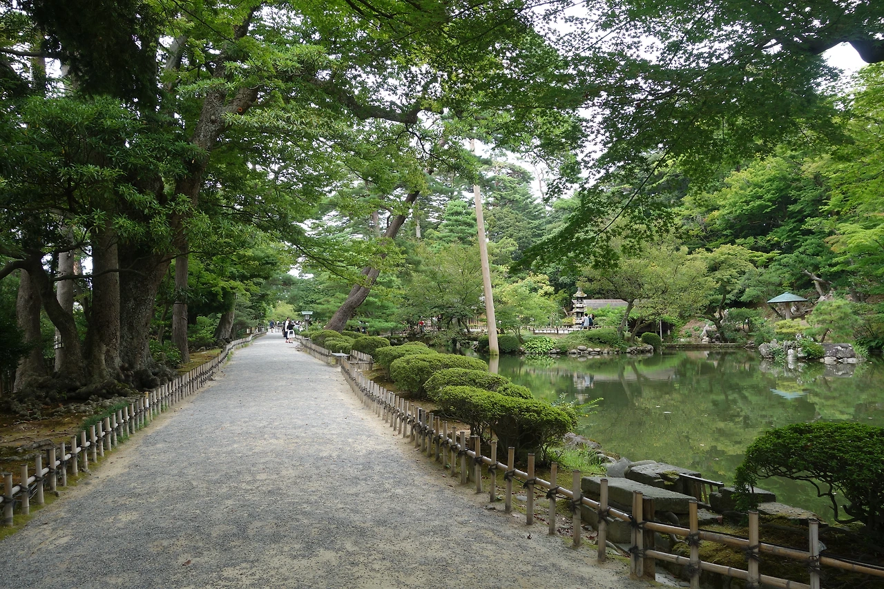 신기한 음식을 먹어본 뒤, 또 아무 생각 없이 가 보기로 한다. 가나자와에 유명한 정원이 있다는 말을 듣고 한번 가 보기로 했다. 원래는 날씨가 좋지 않을 것 같아 별로 볼 것이 없을 듯 해 흥미가 없었는데, 그래도 날씨가 조금 좋아져 한번 가 봐도 좋겠다는 생각이 든 것이다. 정원까진 별로 멀지 않아 금방 도착해 입장료를 내고 들어가 보니, 연못과 나무가 군데군데 배치된 정원이 나온다.