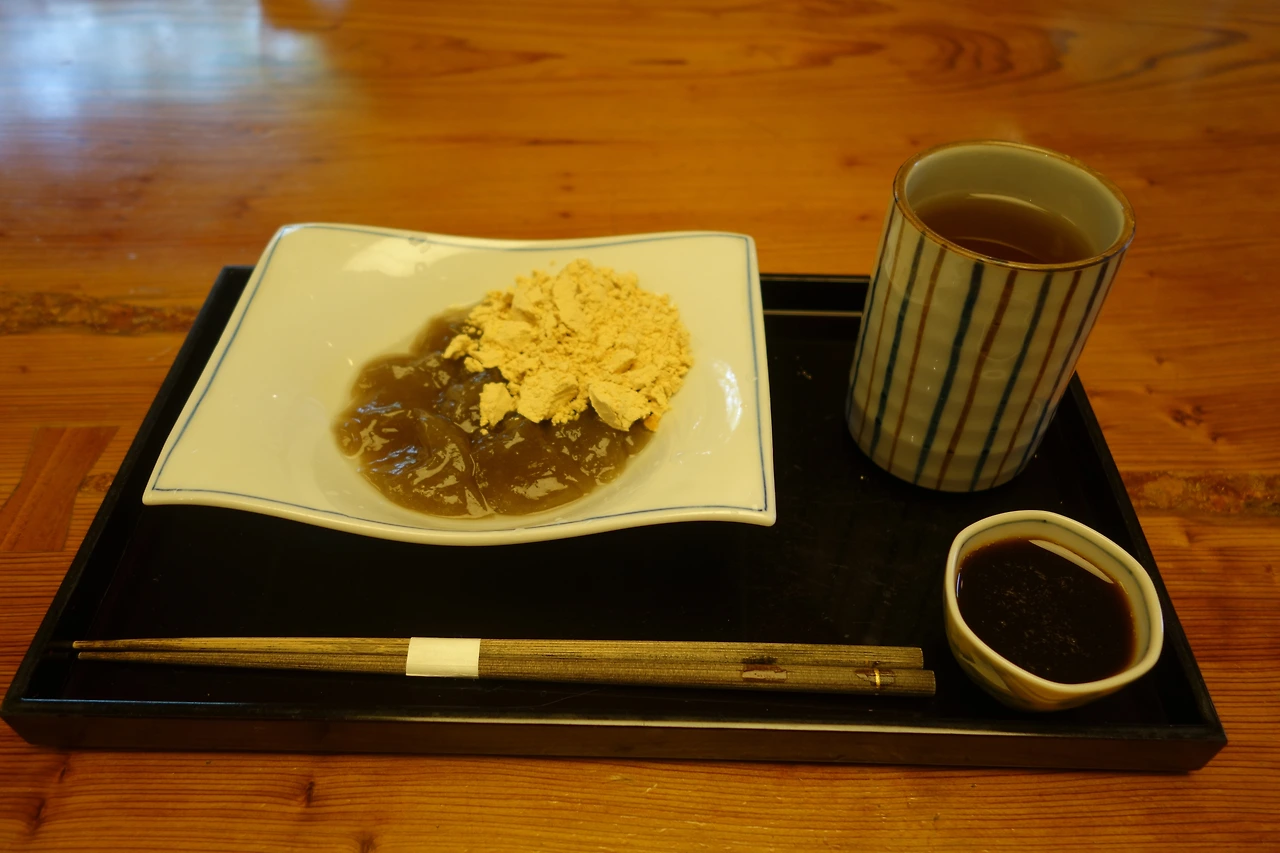 잠시 시간이 지나자 주문한 와라비모찌가 나왔다. 젤리에 가까운 물렁한 식감의 떡과 콩가루, 그것을 찍어 먹을 시럽이 나오는데 시럽은 흑당 시럽 같았다. 같이 먹는 차가 나오는데, 나는 차를 잘 몰라서 차가 맛있는지 어떤지는 잘 몰랐다. 떡을 콩가루에 찍은 뒤 시럽에 찍어 한입 먹어 보니, 맨 처음엔 이게 뭔가 싶은 생각이다가도 생각해 보니 맛이 괜찮았다. 떡 자체는 특별한 맛이 없는 것 같아도, 고소한 콩가루와 짙은 흑당시럽의 맛에 조화가 잘 어울린다. 먹다 보면 남을 수 있는 맛은 차로 깔끔하게 정리된다.
