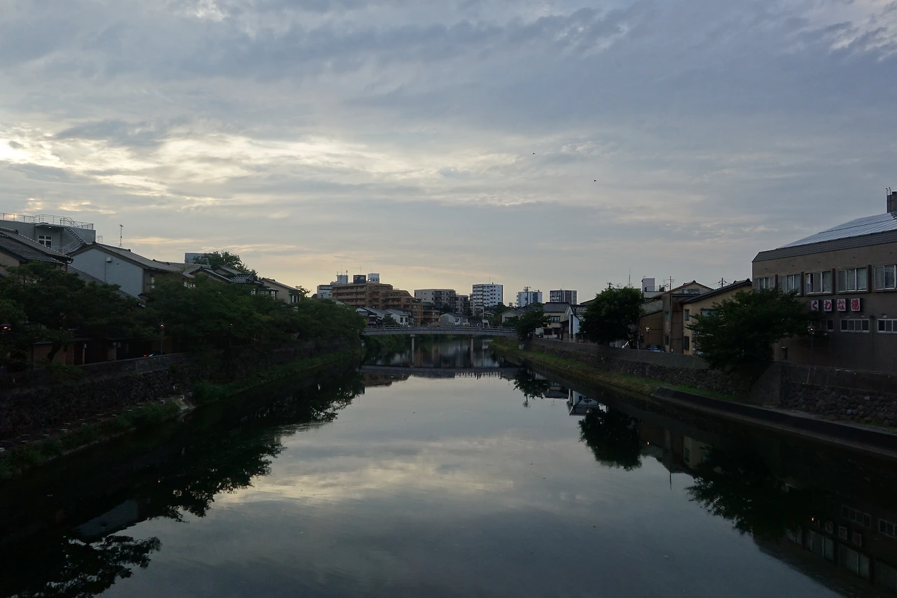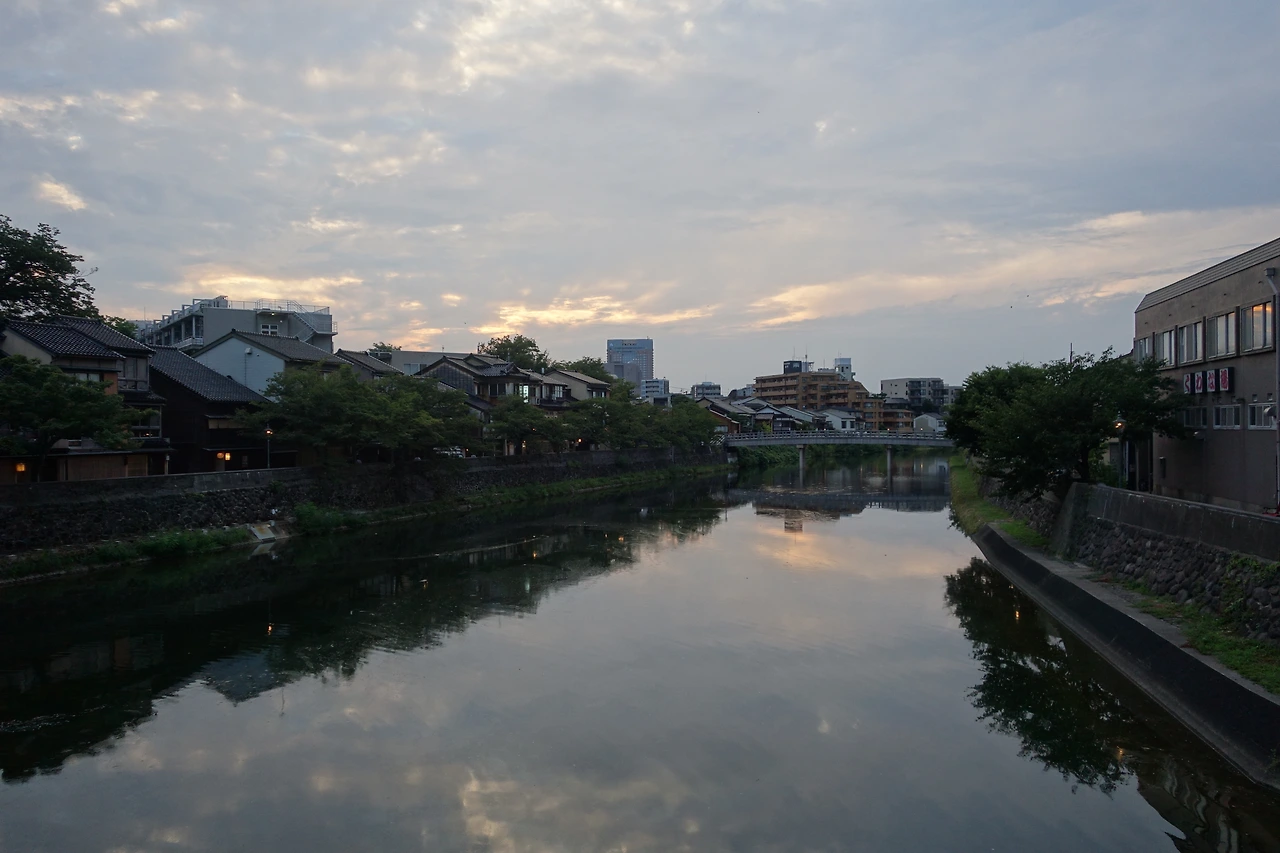 정원 구경을 마치고 조금 걸어가면 갈 수 있는 곳에 가 보기로 했다. 옛날 건물이 몰려 있는 곳인데 분위기가 좋다고 해서 알아봐 둔 곳이었다. 버스를 타고 갈까 했는데 버스를 타기에도 애매한 거리라, 그냥 마음 편하게 주위 구경을 하며 걸어가 보기로 했다. 목적지에 가다 보니 아까 낮에 봤던 것 같은 강을 건넜는데, 해가 질 때 쯤 되니 하늘에 노을이 조금씩 생기고 있었다.
