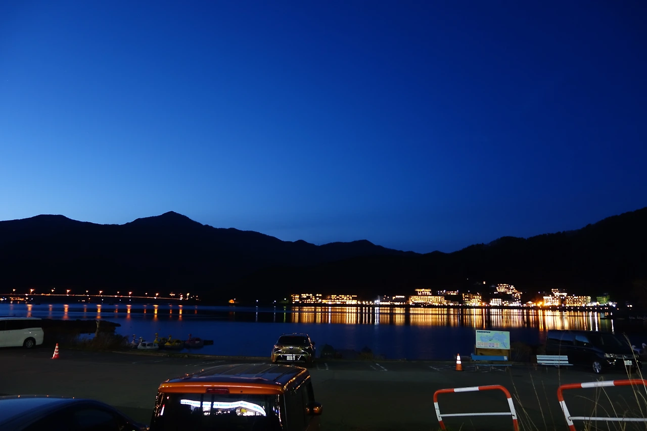 사람이 별로 없어 한적한 역에서 가족과 함께 조금 기다리다 가와구치 호수로 가는 기차를 탔다. 가와구치 역에 도착하고 나서 숙소로 가는 길의 신호등 앞에 서니, 하늘은 저녁의 짙푸른 어둠으로 물들어 있었다.