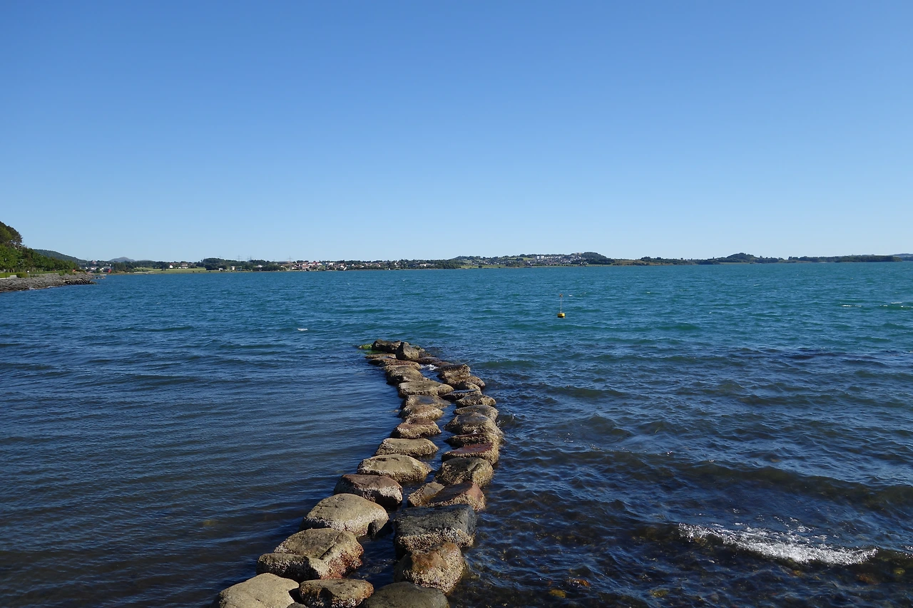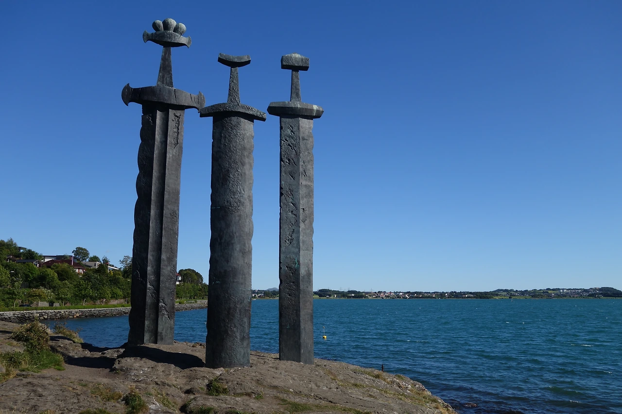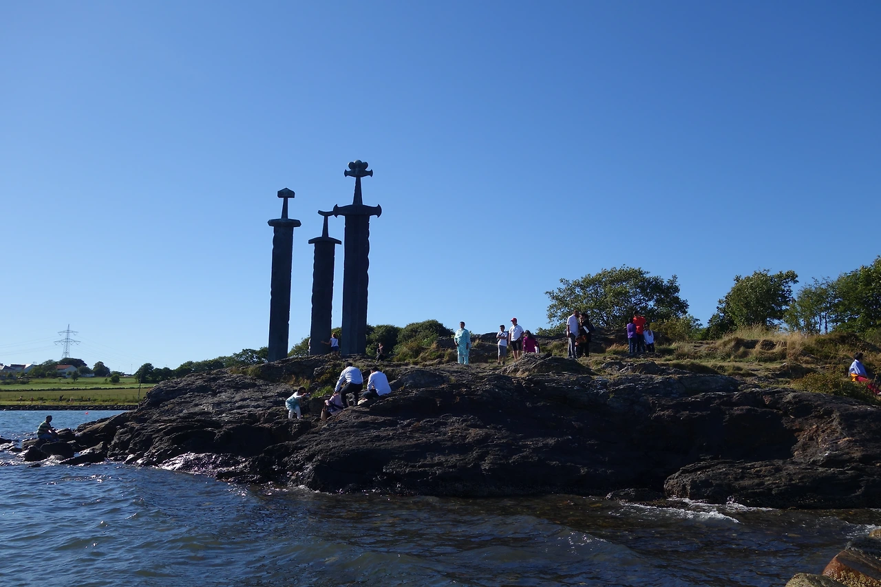 평화로운 주택가를 좀 지나면 목적지가 나온다. 현지인들이 평화롭게 시간을 지내고 있는 자갈 해변 옆으로 바위에 칼 모양의 철제 구조물 3 개가 꽂혀 있다. 옛날 하랄 1세 라는 사람이 최초의 통일 노르웨이를 세운 장소라 한다. 그때 세 가문을 통일했기에 칼 3개가 꽂힌 기념비를 만들었다 한다. 바위에 철 구조물이 꽂혀 있는 것도 이국적이지만, 근처에서 현지인들이 느긋하게 시간 보내는 것을 구경하는 것도 재미있다.