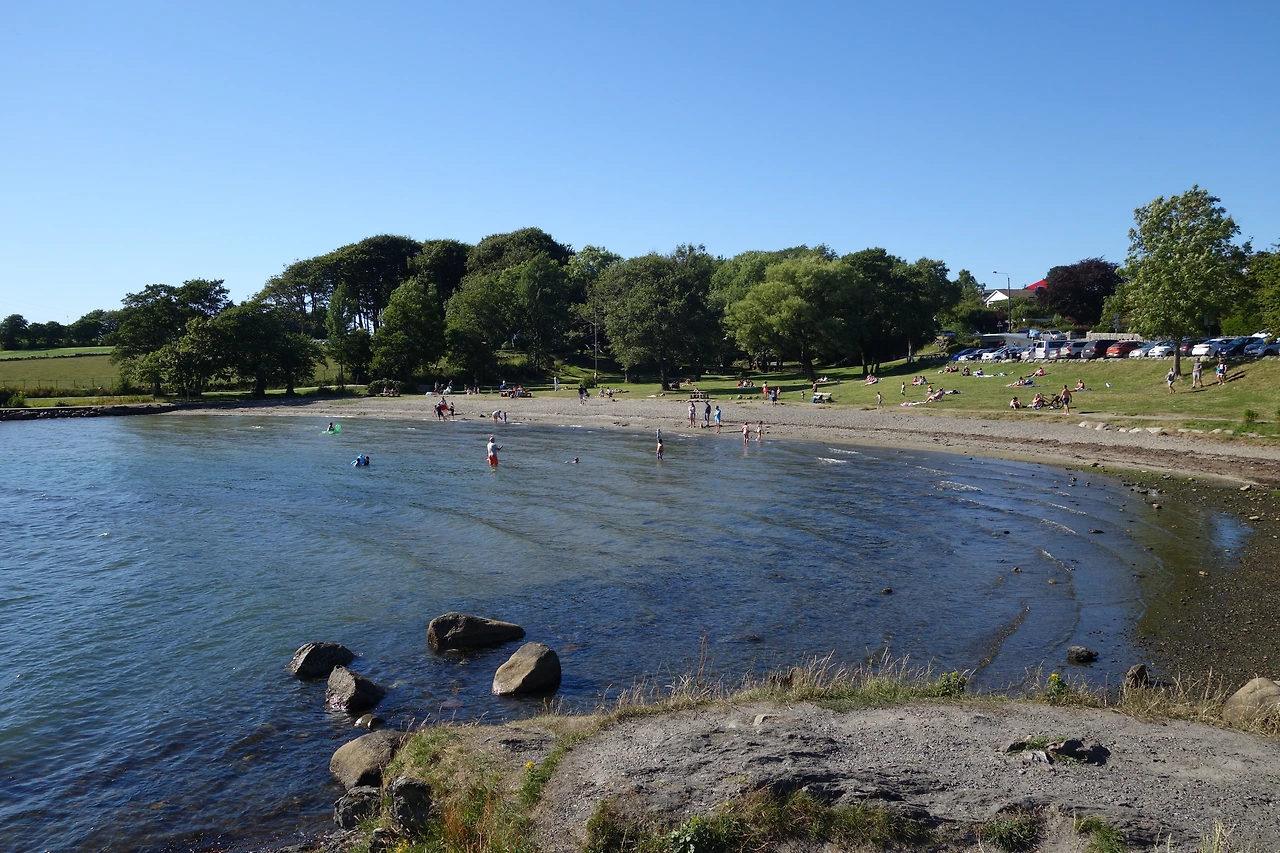 해변 쪽에서 소풍을 하며 시간 보내는 사람들을 볼 수 있다. 조형물 아래에는 사람이 많다.