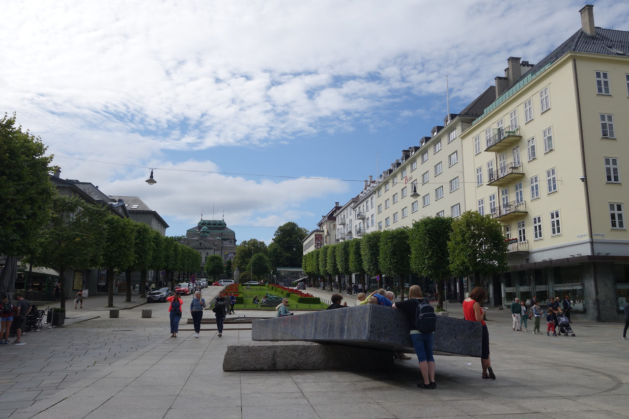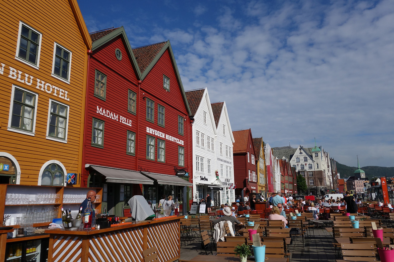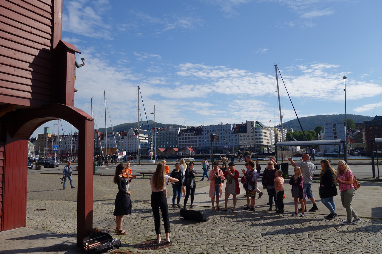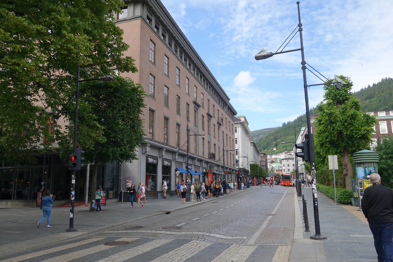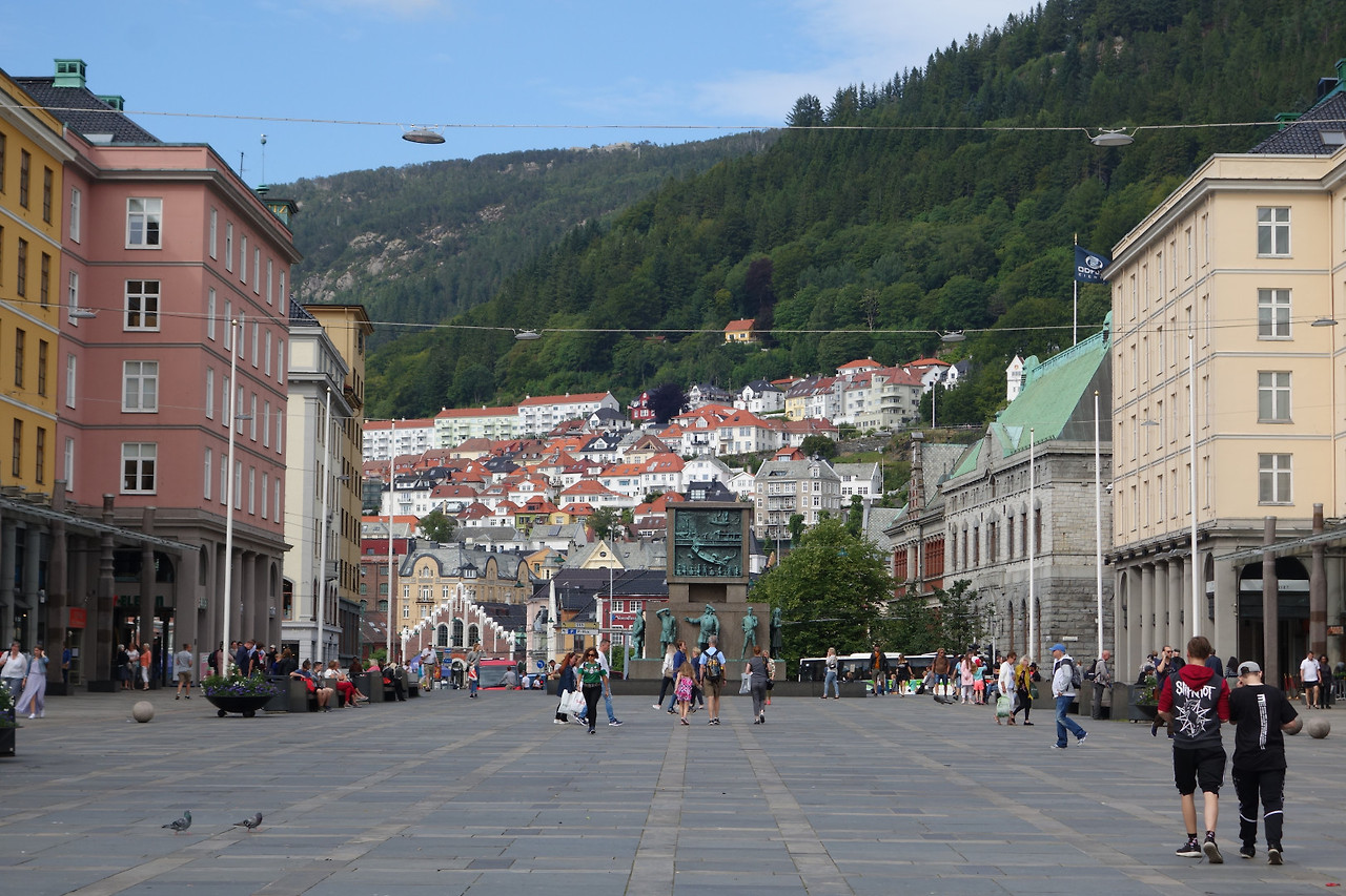 베르겐 버스 터미널에서 얼마 가지 않으면 기차역이 있고 그 옆에 숙소가 있었다. 일단 숙소에 짐을 맡겨둔 뒤 베르겐 시내를 조금 돌아 보기로 했다. 베르겐은 노르웨이에서 수도인 오슬로 다음으로 큰 도시이다 보니 사람들이 많다. 도심 중앙의 광장과 그 주위 다양한 건물들 사이로 둘러싸인 대로를 걸어 항구 쪽으로 가면 어시장이 있다. 현지인들은 학을 떼는 모양이지만 그래도 여행자들에게는 한번 가 보기엔 좋다. 이때가 월드컵 경기 중이었기에 월드컵 중계를 하고 있는 음식점에 사람들이 잔뜩 몰린 것도 볼 수 있었다. 근처의 신선한 딸기류를 준비해 컵에 담아서 파는 것 같은 사람들도 보였다.