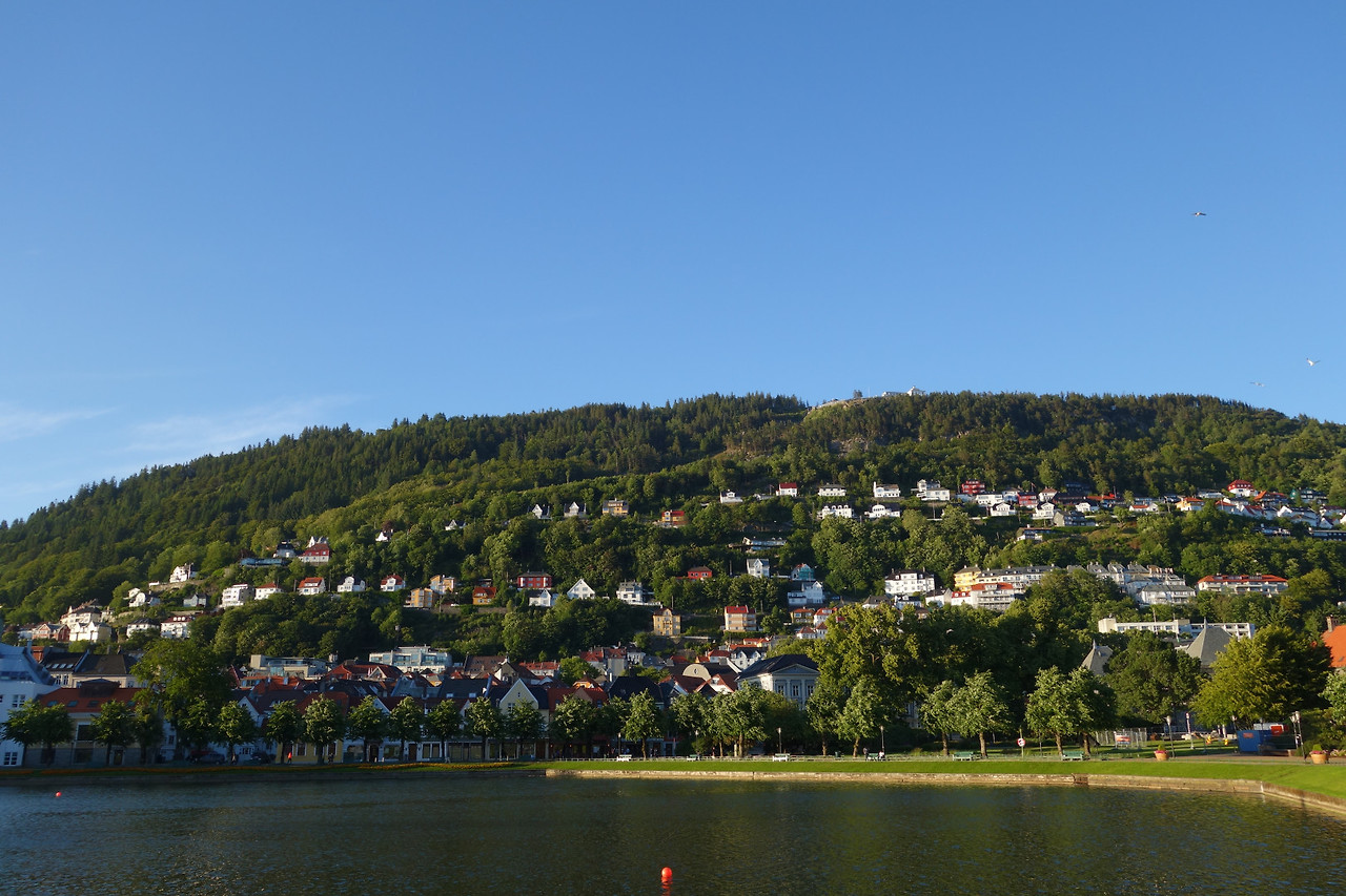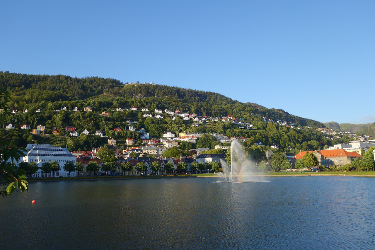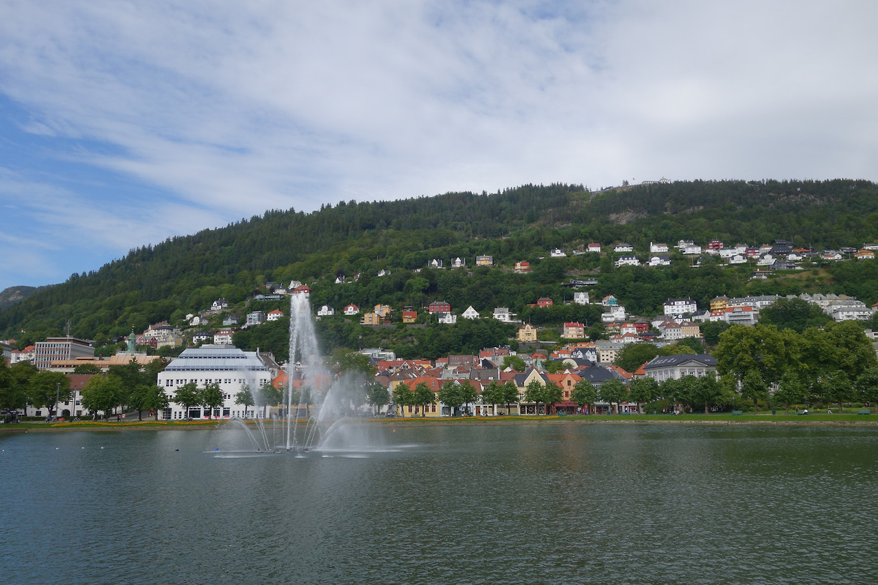 플로옌 산에서 내려와 저녁까지 먹고 난 뒤 천천히 걸어가다 보니 베르겐 시내 호수에 다시 돌아왔다. 오전 처음 베르겐에 도착했을 때는 구름이 잔뜩 껴 있었는데, 저녁이 되니 구름이 모두 물러가고 맑은 날씨에 호수에 무지개까지 보인다.