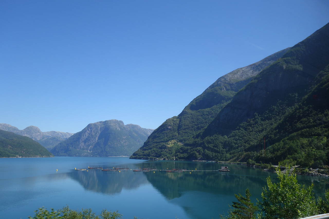 빙하가 녹은 물이 폭포가 되어서 흘러내리는지 피오르드 안쪽으로 가는 버스에서 폭포를 자주 볼 수 있었다. 작게 시냇물처럼 흘러내리는 것도 있었고, 딱 봐도 엄청 큰 물줄기가 되어 흘러 내리는 폭포들도 있었다. 바다에 원형으로 떠 있는 구조물들도 볼 수 있었는데, 그 명성이 자자한 노르웨이 연어들이 저런 곳에서 오는 건가 싶었다.