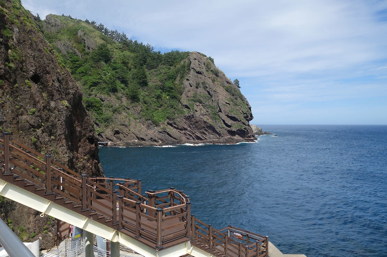 해안산책로는 여객터미널 쪽에서 인도로 연결되어 편하게 걸어갈 수 있었는데, 울릉도의 바위투성이 해안선을 따라 길이 나 있는 형태였다. 중간중간 암석 위에 보행도로를 만들어 놓은 곳도 많았는데, 짙푸른 동해 바다와 함께 맑아진 하늘을 함께 구경하기에 제격이었다. 산책로는 꽤 길이가 긴 느낌이라, 설렁설렁 걸어가며 바다를 구경했다.