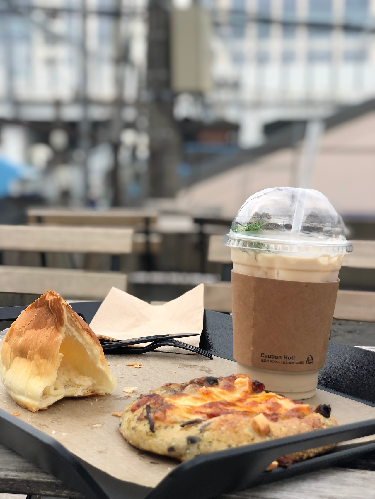 비록 아침에 조금 늦잠을 자서 생각했던 것보다는 늦게 카페에 도착했지만, 안쪽을 천천히 구경하고 빵과 음료를 골라 카페 위층으로 갔다. 옛날 공장 건물을 인수해 만들어진 카페의 옥상은 바깥 공간을 즐기기 좋게 되어 있었다. 비록 화창하지는 않은 날씨가 약간은 흐리지만, 괜찮은 자리에 앉아서 앞쪽 고가도로에서 지나다니는 전철을 보며 빵을 먹었다. 생각보다 크게 특별하지는 않았던 소금빵과, 아침으로 먹기 좋은 버섯 포카치아, 홍차 배합이 인상적인 밀크티까지.