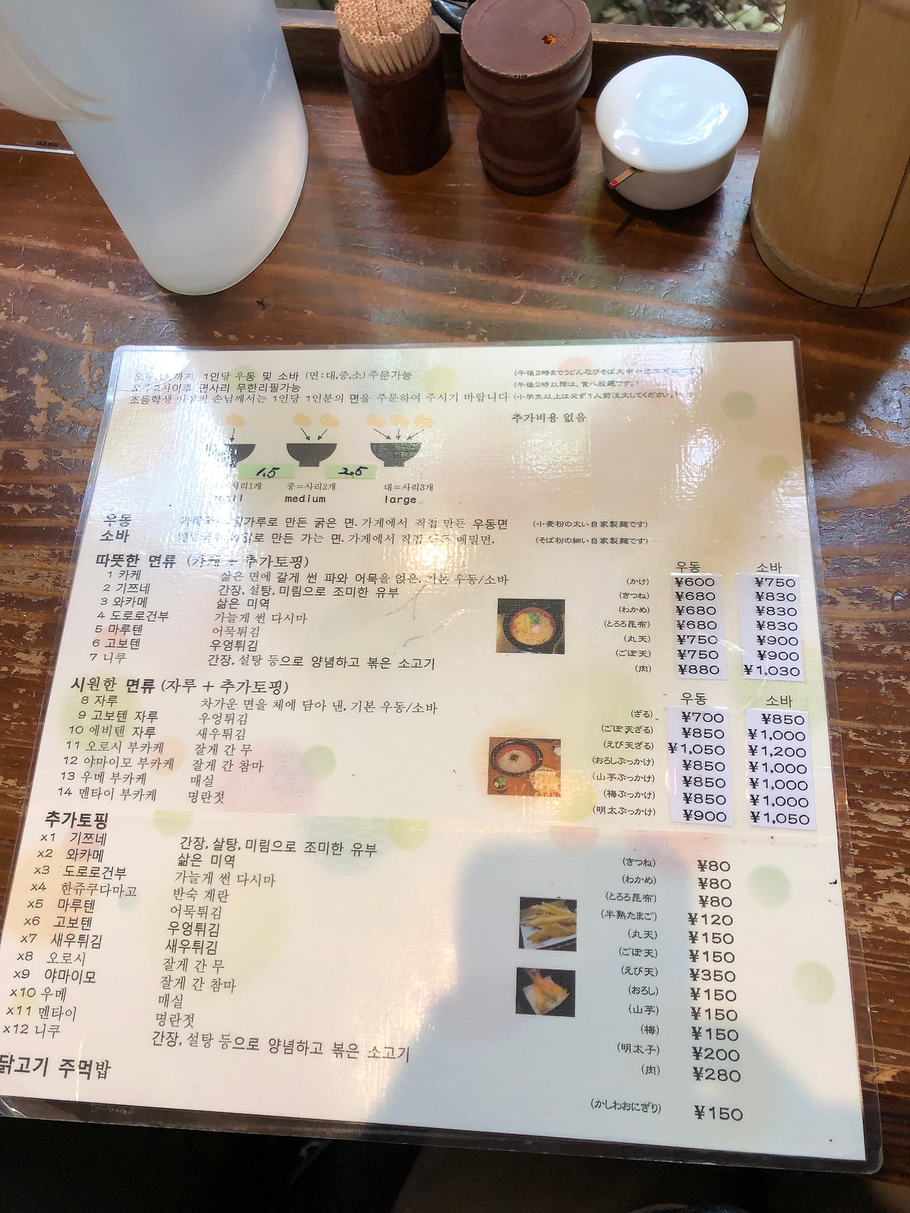 면 요리를 좋아하지만 평소에 소바나 우동을 많이 먹지는 않으니, 한국에서 먹는 것과 어떻게 다른가 생각해도 기대한 것보다 엄청나게 다른 것을 찾지는 못했던 것 같다. 한국의 고깃집과 일본의 야키니쿠 스타일은 아 이건 정말 다르네, 라고 느꼈던 것이 많았지만 이 소바집에서는 별다른 것을 느끼지 못했던 것 같다. 기껏해야 사이드 메뉴로 후쿠오카의 명물인 명란젓이 주문 가능하다는 것과 토핑으로 참마 같은 것들이 있다는 것 정도일까.