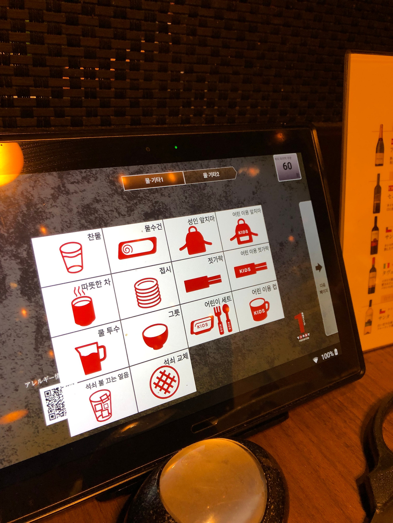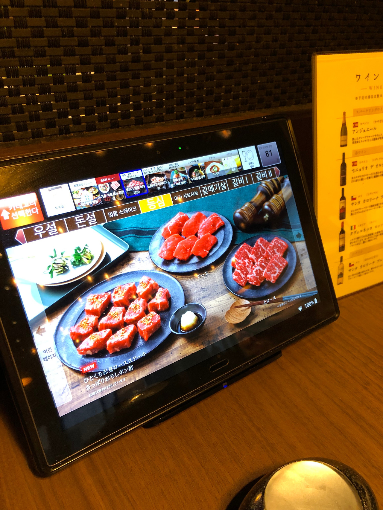신기했던 것은 많은 한국 음식들이 사이드로 있었다는 것인데, 냉면, 순두부찌개, 김치, 한국식 쌈채소 등이 키오스크 안에 별도의 코너로 마련되어 있었다. 다른 야키니쿠 집은 어떨지 모르겠지만, 일본식 야키니쿠 집 안에 한국에서 볼 수 있는 음식들이 함께 준비되어 있는 것을 보니 신기했다. 요새 한국에서도 일본식 고깃집이 성업중인 것과 비슷한 느낌일까.