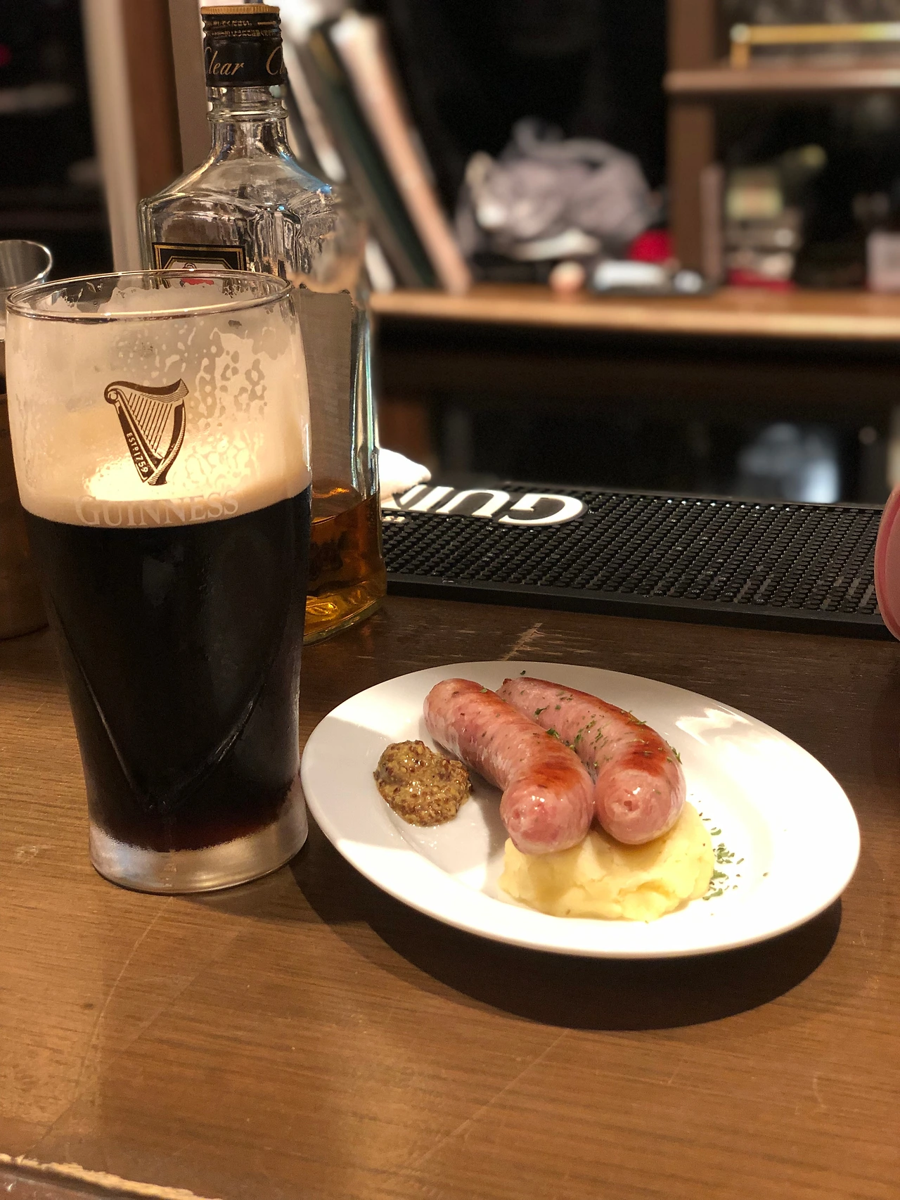 먼저 나온 기네스 흑맥주를 조금 마시고 있으니 소세지가 나왔다. 긴 접시에 매시포테이토를 올리고, 그 위에 그릴 자국이 있는 소세지를 올리고 홀그레인 머스타드를 덜어 올렸다. 간단하면서도 빈틈없는 구성이 내 취향이다. 소세지를 한 입 먹어 보았다. 그런데...왜 맛있지? 거친 고기 입자가 씹히는 느낌이 정말 내가 좋아하는 취향의 소세지였다.