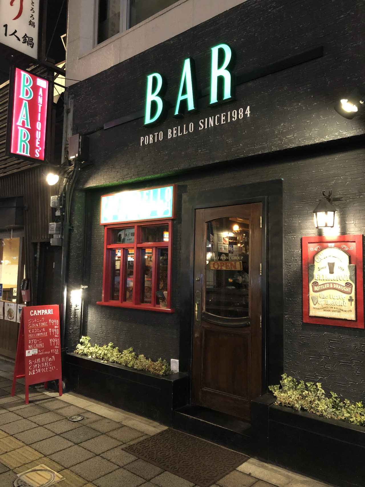 그날 저녁을 먹으러 가기로 결정해서, 다시 그곳으로 걸어가 보았다. 후쿠오카의 유명한 강변 포장마차 거리가 있는 곳에서 조금만 더 가면 있는 그 가게는, 사실 일본 가게 같은 느낌은 아니었다. 유럽에나 가면 있을 법한 간판과 벽돌 모양, 창문 디자인까지. 가게 간판에도 적혀 있다. 아이리쉬 펍 이라고.